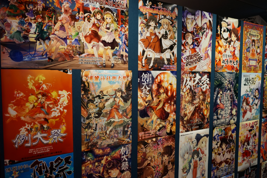 出口手前の通路には同人誌即売会『博麗神社例大祭』の歴代カタログの表紙イラストが。これもまた二次創作の歴史ですね。