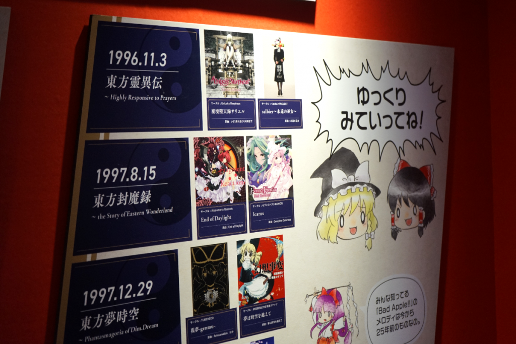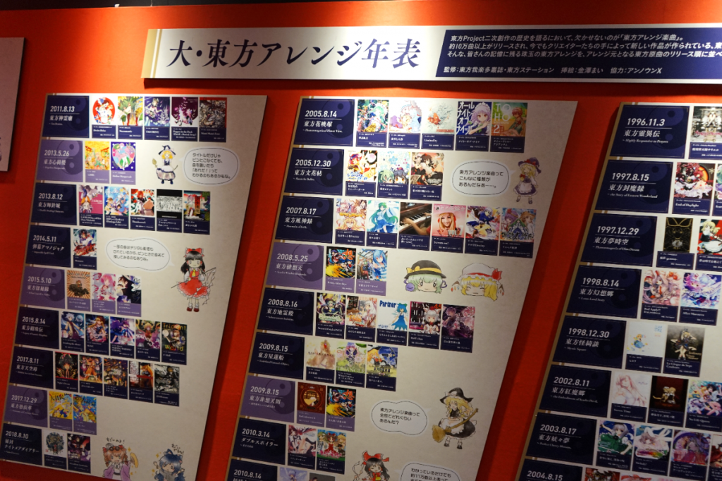 二次創作の展示はまだまだ続きます。続いては各原作を象徴するような二次創作アレンジ楽曲をまとめた「大・東方アレンジ年表」が、音楽アレンジの歴史を見せてくれます。二次創作ゲームの展示もあり、東方の二次創作が持つ懐の広さが垣間見えます。