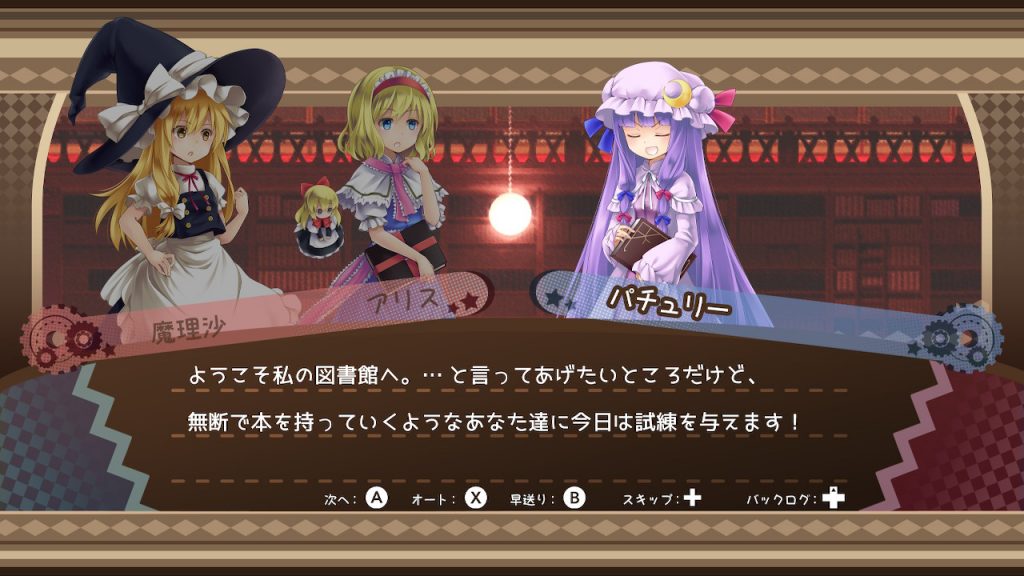 ざっくりシナリオをご紹介すると、本を盗られてばかりのパチュリーがにとりに協力してもらい、図書館を迎撃用トラップタワーに作り変えてしまったので、主人公である魔理沙はアリスを半ば巻き込む形で2人で攻略していく、というもの。
