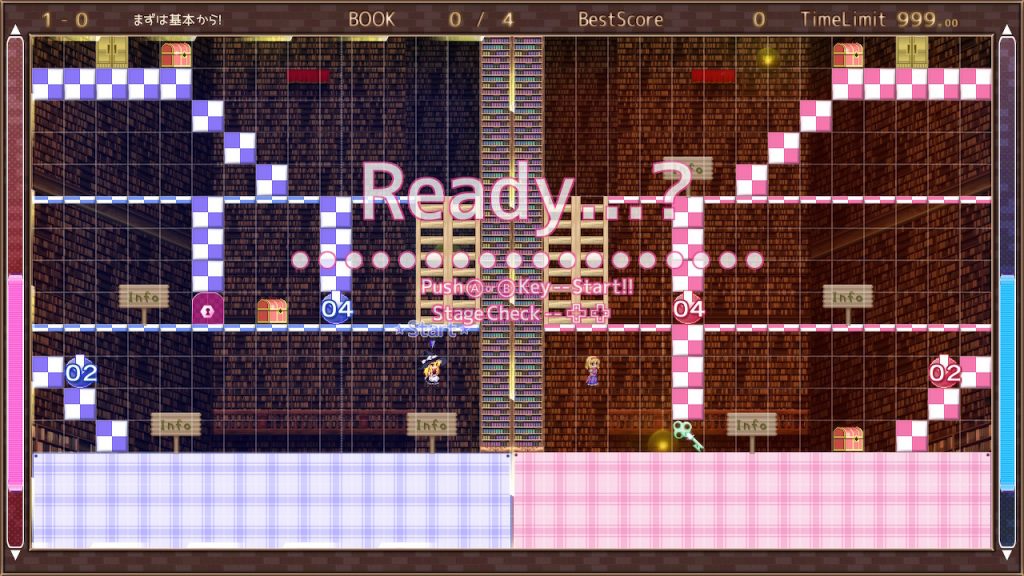 ですので、このゲーム自体もシナリオに沿う形で、魔理沙とアリスの2人のキャラクターをうまく使い分けながら本を回収し、ゴールを目指すといった非常にシンプル内容になっています。アクションにありがちなダッシュ操作もないので、必要なのはジャンプだけです。