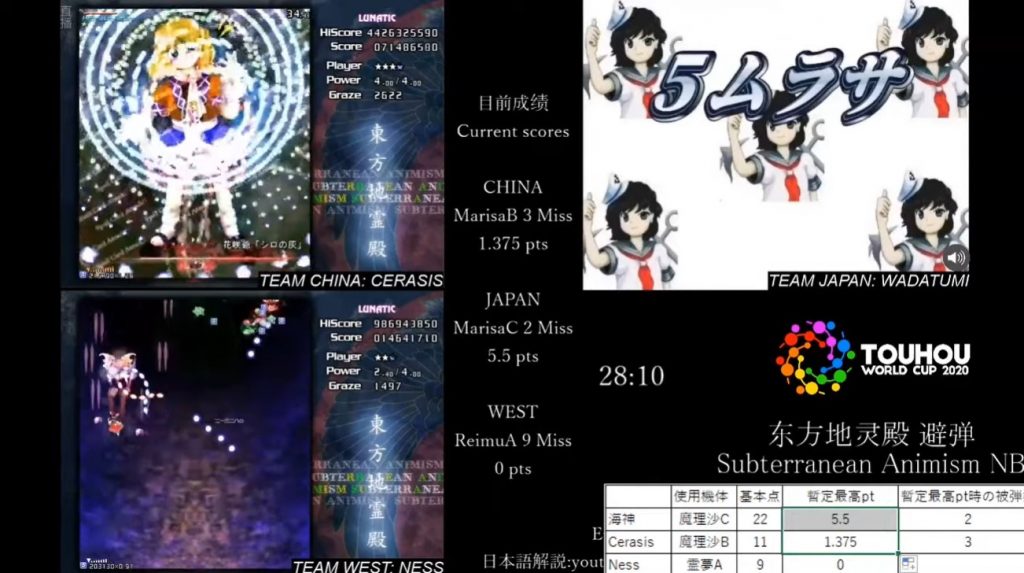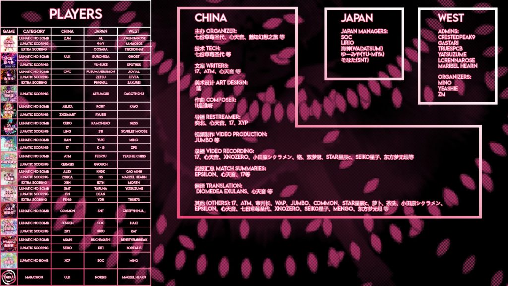 こと、運営に関しては私も関わりが無かったので分かりませんが、日本の選手に関してはSOCさんが殆ど人集めをしていました。昔から東方をやっていて顔が広かったということもあり、SOCさんに誘われて参戦した日本の選手は沢山おられました。TWC2020は国対抗のチーム戦だったのですが、日本チームは参加者のいない部門がほぼ無かったほどです。西欧の運営も同様にアンテナを広げ、選手を募っていたようです。