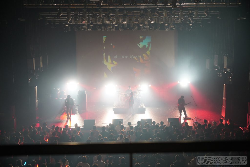 「博麗神社うた祭来てくれてありがとう! 楽しんでいきましょう!」とVo.Nachiさんが一曲目『Monster』で会場に熱を入れていく。Nachiさんのスラリとしたパンツスタイルが麗しい。