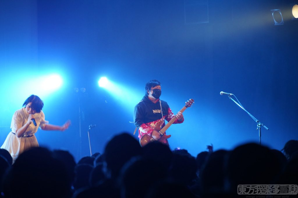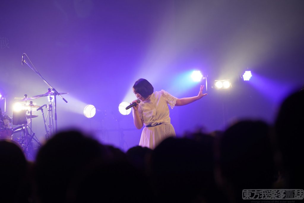 暗転し、Vo.cheluceさんが登場。Nachiさんの黒の装いに対して、白のワンピースのcheluceさん。対になっているのでわかりやすかった。紫の照明とともにスクリーンには永琳が映り、二曲目『月華蝶』がスタート。観客の声はさらに大きくなる。