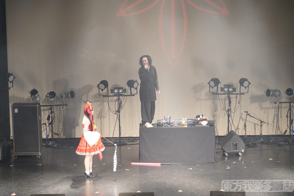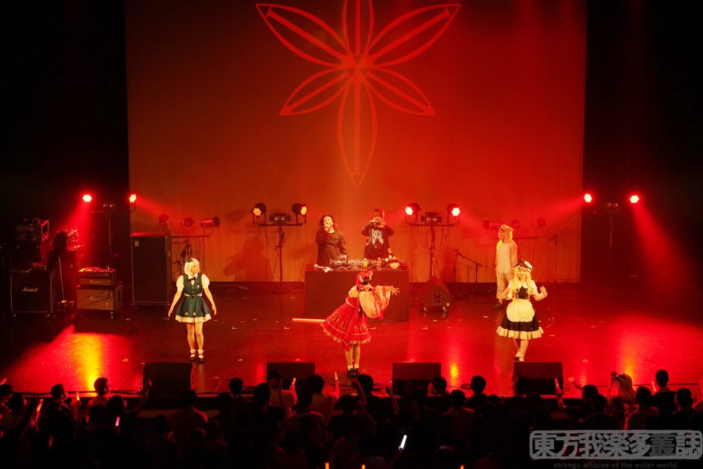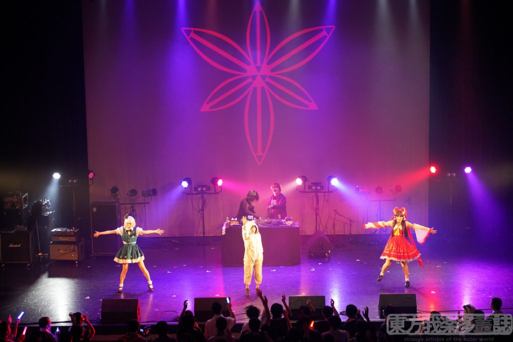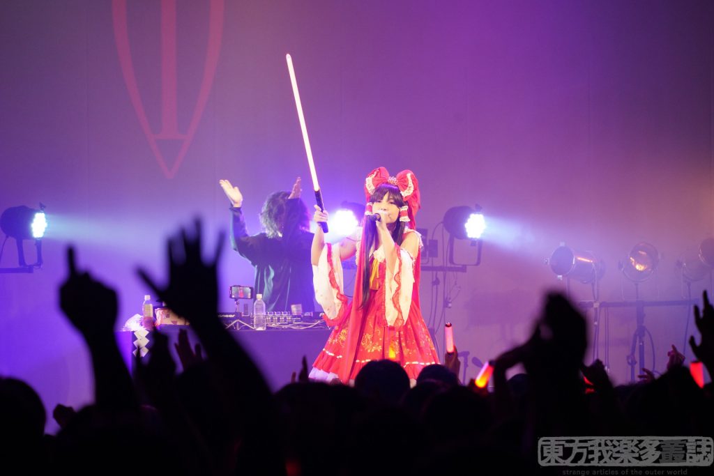 博麗霊夢(ボーカル ayame)、魂魄妖夢(ダンサー KI紗)、霧雨魔理沙(ダンサー miho**)と、幻想少女たちが続々とステージに上り、各テーマカラーの光を放つライトセーバーを使ったダンスで会場を魅了する。