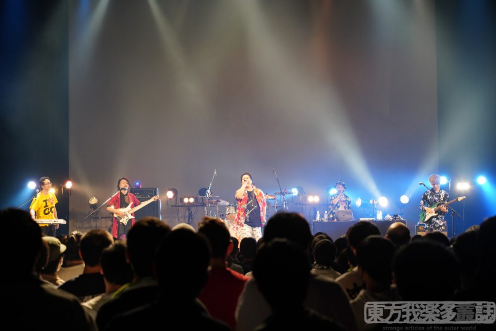 そして、熱気を湛えた会場に最後の演者たちが現れました。Dr.まこっちゃん、Key.狐夢想、DJ.まろん、Ba.ムー、Gt.テラ、そして、Vo.ビートまりお。今回のクークリはバンド形式! アドリブのコール&レスポンスも即座に対応可能な鉄壁の布陣に、期待が高まります。