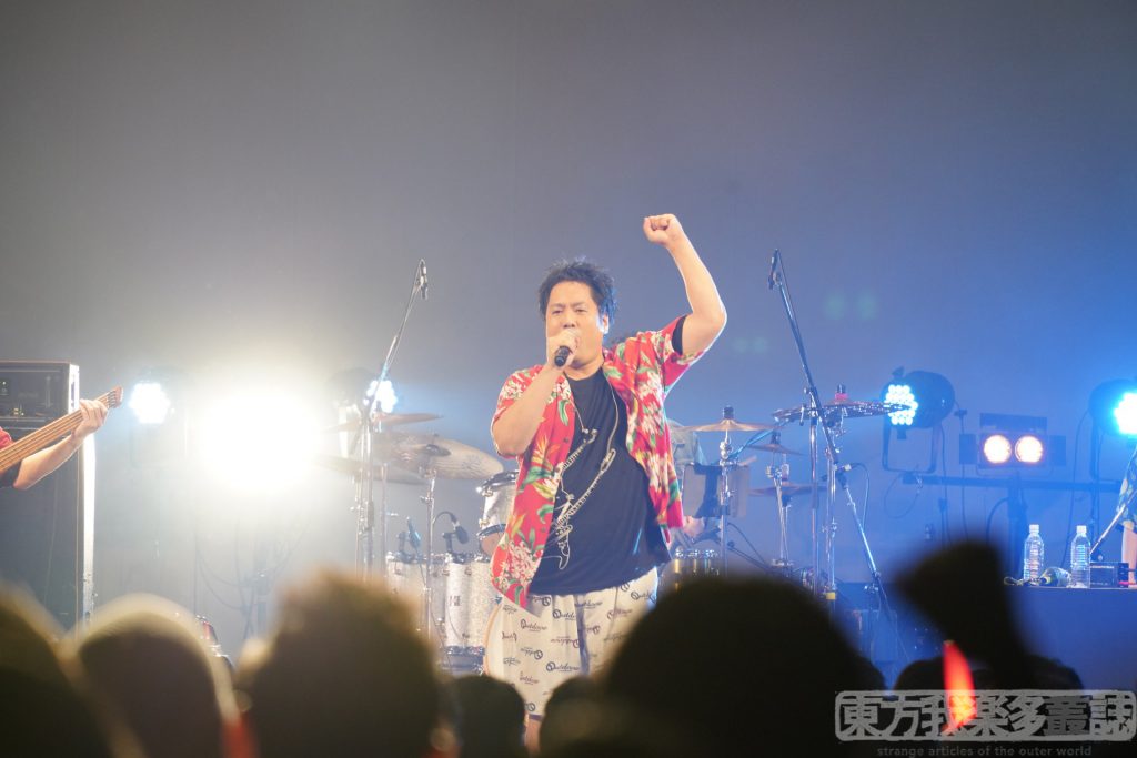 そして、ライブ版恒例のメンバー紹介とコール&レスポンスタイム。それぞれのパートで楽器を掻き鳴らすシーンが、最高に格好良いのです。スティックをクルクル回転させながらロールするDr.まこっちゃんに、大きな声援が飛びます。Key.狐夢想氏の『毛深くて!もふもふで!トッテモカワイイカゲロウチャン!!』自己主張が激しくて笑いが止まらない。