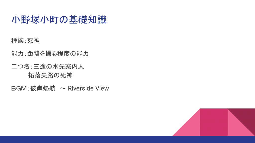二つ名は「三途の水先案内人」です。まんまですね。「拓落失路の死神」というのもあります。拓落失路とは落ちぶれて出世の道が閉ざされた状態という意味らしいですが、落ちぶれたということは、元々はそこそこの地位に居たということでしょうか。約一名からは「サボタージュの泰斗」と呼ばれたりもしていましたね。