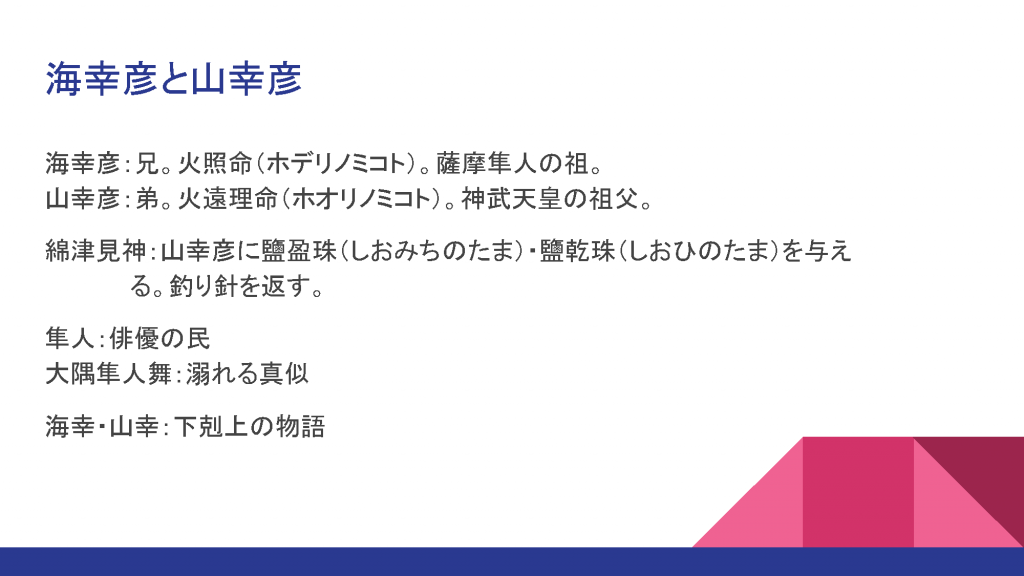 とりあえず日本神話から始めましょう。海幸彦と山幸彦の話は割と有名かと思いますが、ざっくりおさらいします。