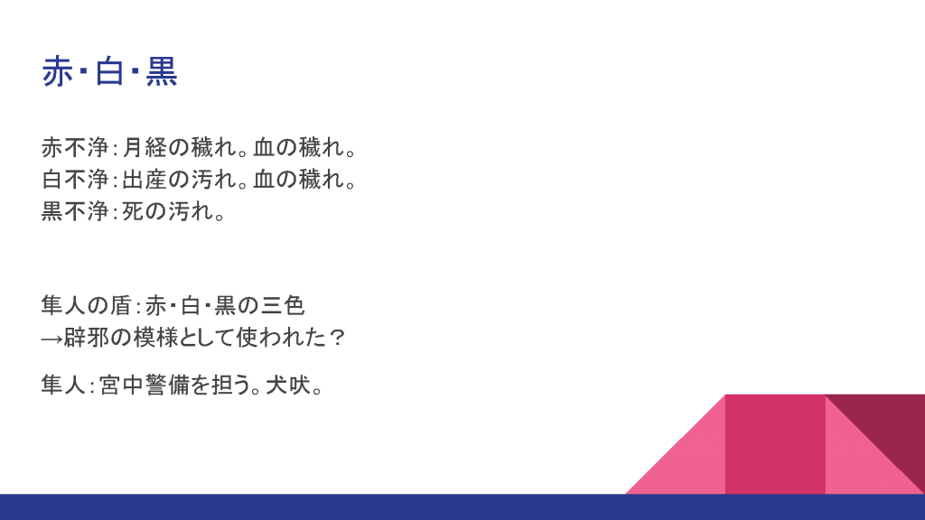 視点を変えてみましょう。不浄の色としてではなく、この三色でなにか別の括りがあるのかもしれません。ということで、先程出てきた隼人です。日本では防具としての楯が発達しなかったと言われることがあります。とはいえ歴史上で一切楯が存在しなかったということではありません。隼人は宮中の警護に当たっていたわけですが、平城宮跡から隼人の楯と呼ばれるものが見つかっているそうです。赤・白・黒の三色を用いて模様が描かれており、おそらく辟邪の効果を狙って施された装飾だろうと言われています。