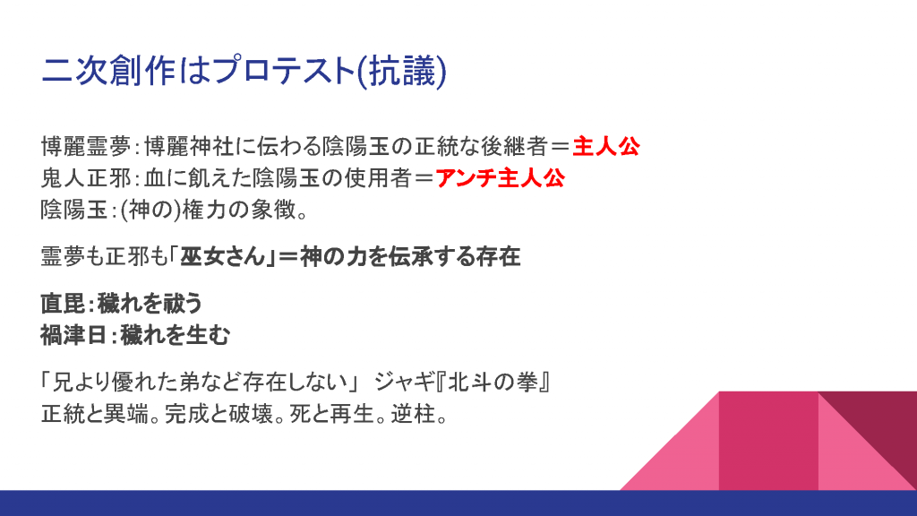 つまり正邪はジャギ様だったということですね。人と鬼の2つの力を使うところは北斗と南斗の2つの流派を使う器用さと解釈できます。小物で主人公のアンチ的な存在であり、シン(針妙丸)を唆し主人公にけしかけるあたりも、そっくりだと思います。そうなると、正邪が霊夢の姉的存在になってしまいますね。姉より優れた妹。幻想郷にもそこそこいる気がします。そもそもどっちが姉なのか。