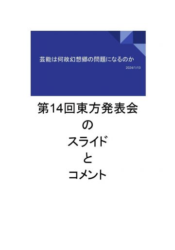 頒布物はコラムと同じ形式のコピー本で、東方発表会で発表したスライドに文章を付けたものになります。第十三回『相対性精神学をつくろう』と、第十四回『芸能は何故幻想郷の問題になるのか』の二冊を出せれば良いなぁ……と思っています。値段は一冊300円、二冊セットで500円で頒布予定です。