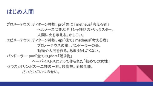 プロメーテウスとエピメーテウスの兄弟は賢い兄と賢くない弟の対比になっています。プロローグとエピローグみたいなものです。やってみないとわからない弟は、兄から忠告されていた「ゼウスからの贈り物」を受け取ってしまいます。「全ての贈り物」という意味の女性であるパンドーラーと結婚したエピメーテウスのせいで、世界中に災厄が溢れてしまったと言えるかもしれません。男と女が結婚することで希望を手に入れ、世界は災いに満ち溢れる、と言うと怒られそうですね。家庭の幸福は諸悪の本らしいですけれど。