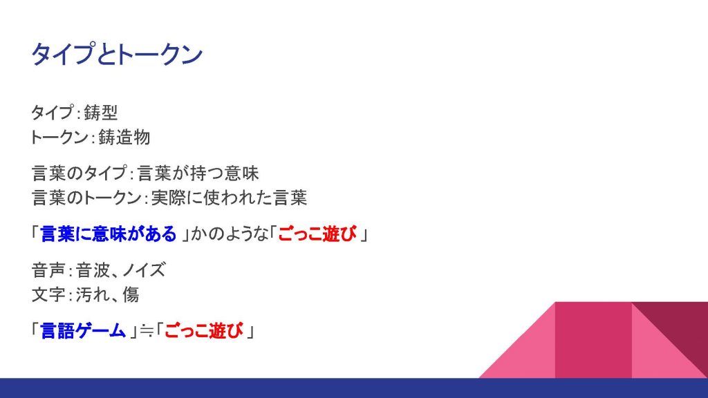 最初に言語という型があって言語行為が成立するのではなく、言語使用という実態から意味が発生すると考えたほうがよさそうです。つまりタイプとトークンの話は順序が逆で、バラバラの表現から同じものとして括れそうなものをまとめてタイプという概念で回収しているわけですね。タイプが機能するのは表現ではなく解釈の段階ということになります。