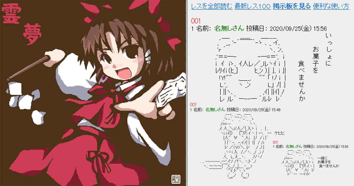 4.頭だけの霊夢がおもしろかったので、いっそもっと丸くしてやろうと思い、いわゆる「まんじゅう霊夢」を作成しました。台詞の「いっしょにお菓子を食べませんか」はほかのAAが喋ってるのを見て、なんとなく響きが良かったので拝借しました。