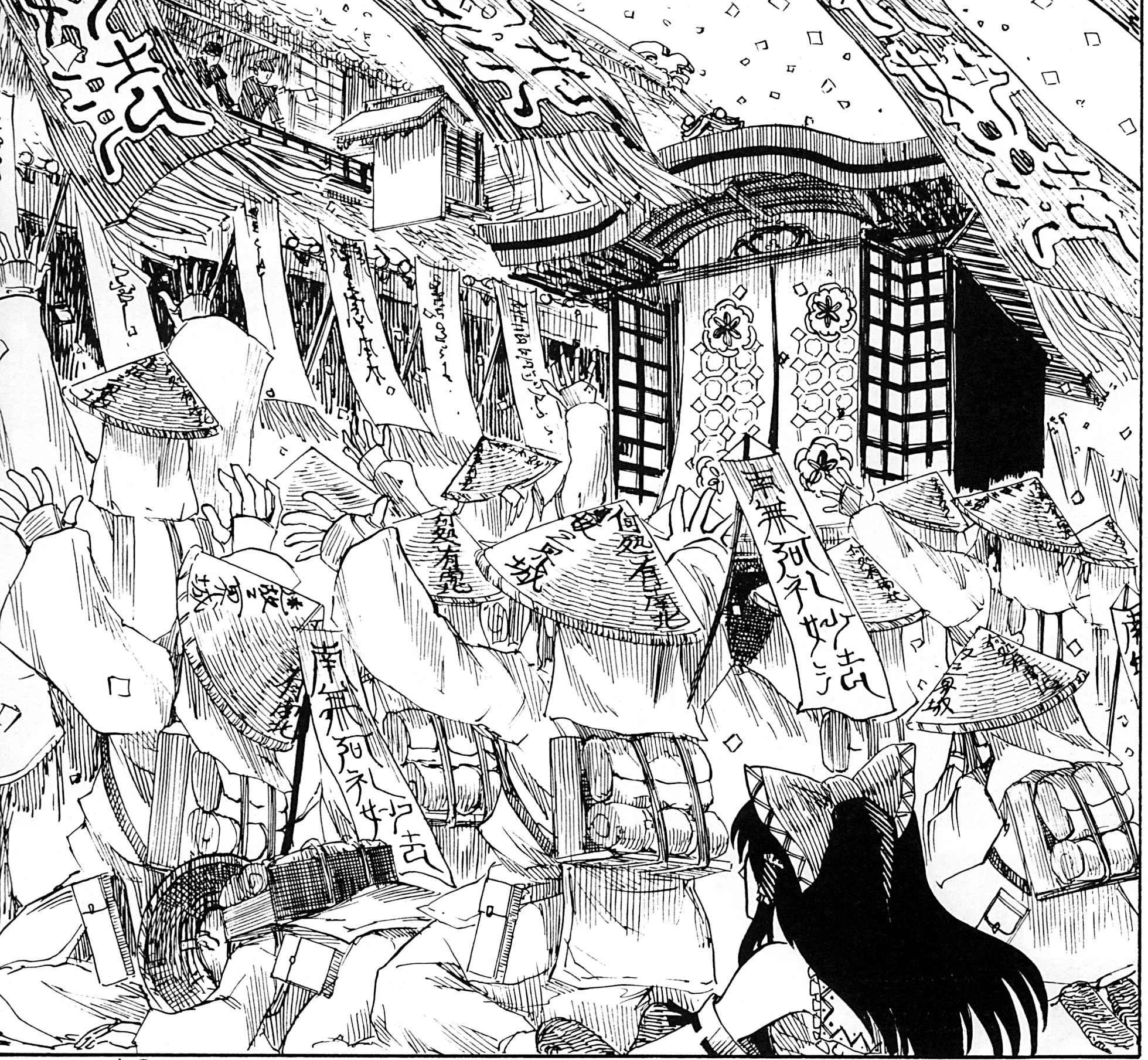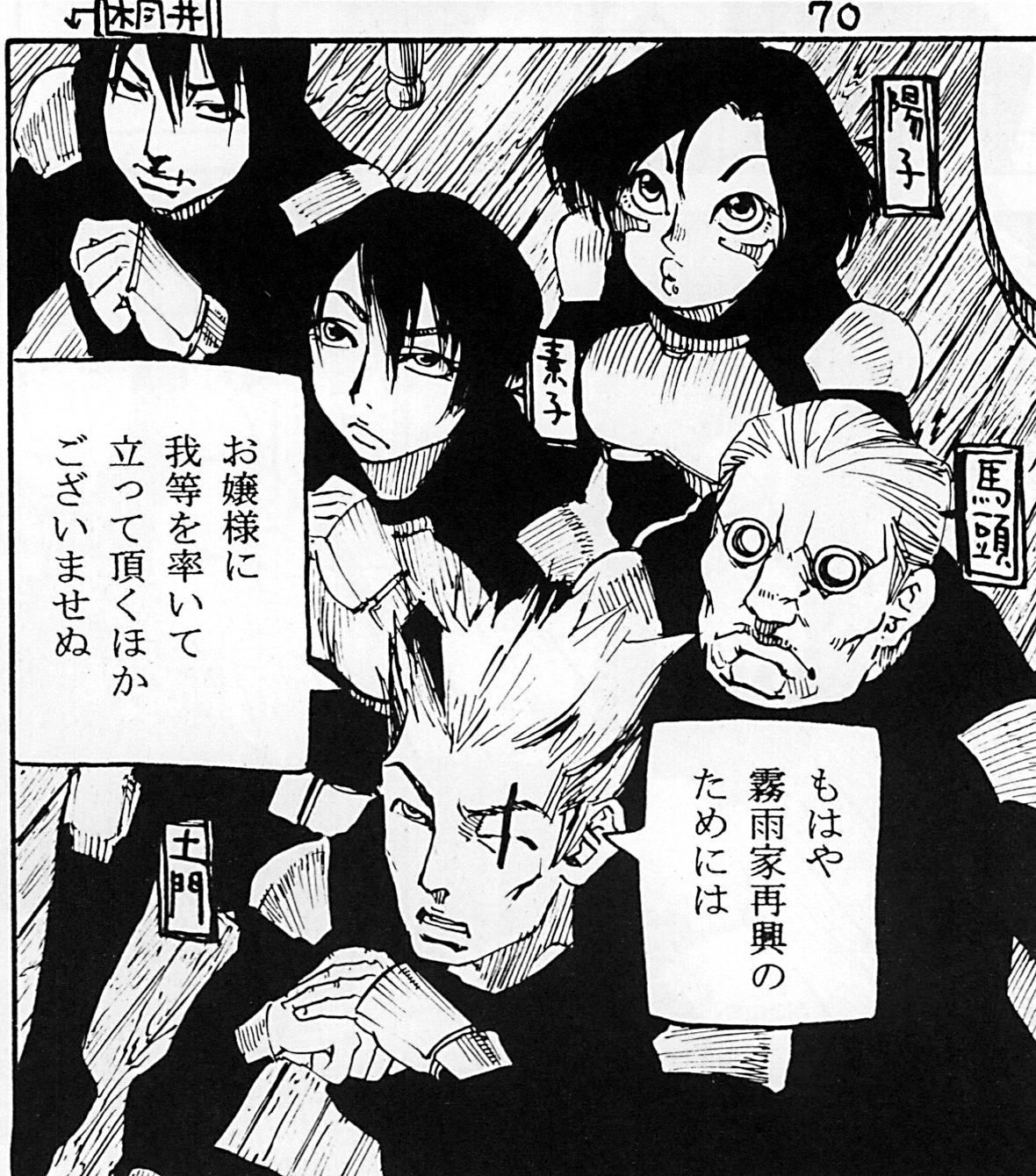 この作品の画には大きな特徴があります。それは、基本的にスクリーントーンが使われておらず、線と墨ベタだけで画面が構成されていること。キャラクターはもちろん、背景のモブや草木のような細かいところまで、びっしりと細かい線が重ねられ、陰影やディテールが表現されています。