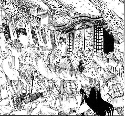 雨山さんが最初に出した東方同人である『THE WORLD IS NOT ENOUGH』(こちらも名作)では「元ネタ」として多数のアニメ・マンガ・ゲーム等の名前が羅列されています。全ては書ききれないので、マンガ系の作品を少しピックアップすると「風の谷のナウシカ」「BLAME!」「ベルセルク」「ナポレオン」「銃夢」「攻殻機動隊」「魁! 男塾」「ヘルシング」「ギャグマンガ日和」「ブラックジャック」などなど…、これだけでも相当なマンガ好きであることが伺えるラインナップです。