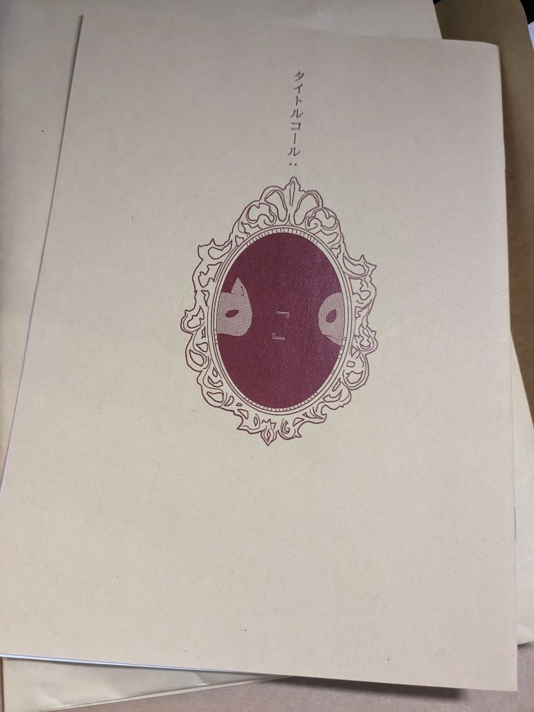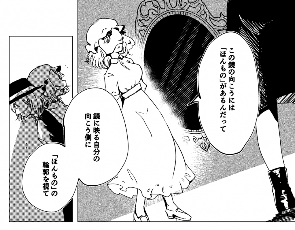 さて、実はこの本「タイトルコール:『』」には、二次創作としての分かりやすい物語の形では、秘封倶楽部は出てきません。ただ、秘封倶楽部になろうとする、猫と鳥の仮面をかぶった二人組がいるだけです。そしてその二人組さえ、実は秘封倶楽部を演じようとする一人の、鏡映しの像に過ぎなかったりします。