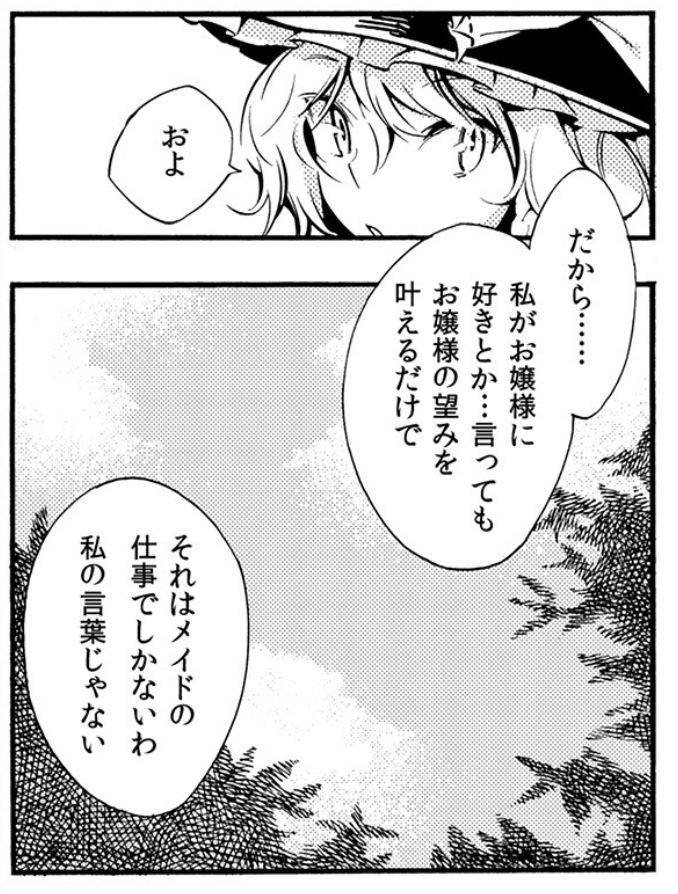 レミリアが望んでいるように、咲夜もまた従者の仕事としてではなく、一人の人間としての恋心を抱いている。ただしここで問題となるのは、十六夜咲夜はメイドをやめるつもりがない、ということだ。