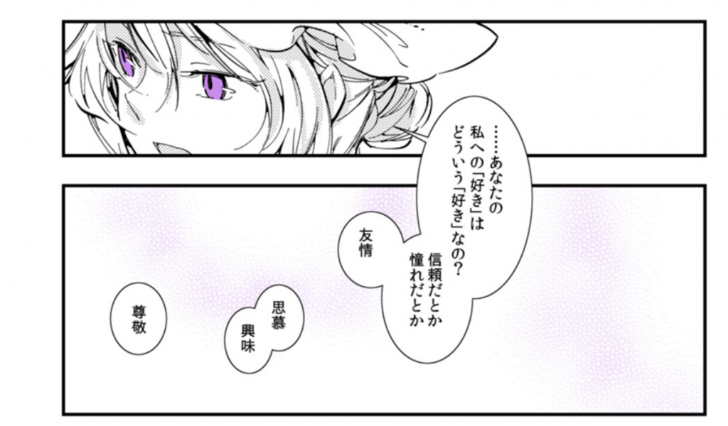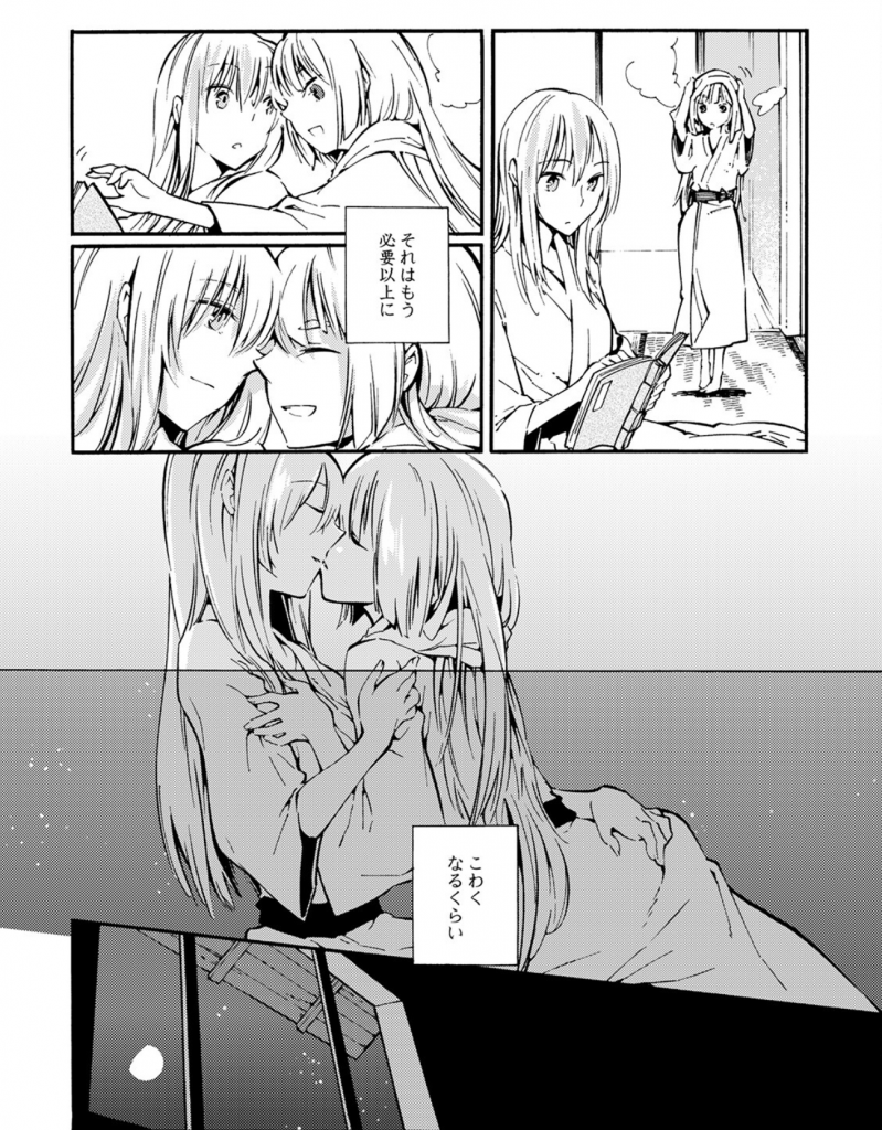 好意を受け入れ、キスをして、共に眠る。仲睦まじい関係性を、妹紅は「必要以上の親密さ」と表現する。これは自分という世界には本来不必要なものなのだ、と線を引いている。にもかかわらず慧音のことを拒絶しないのは、妹紅もまた、慧音のことが好きだからだ。