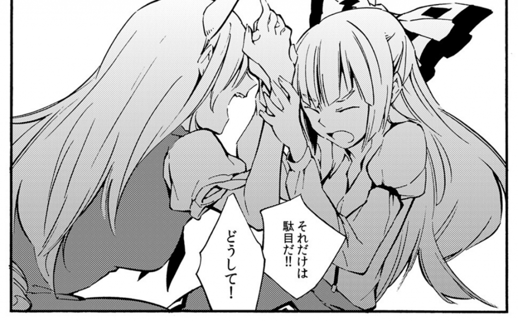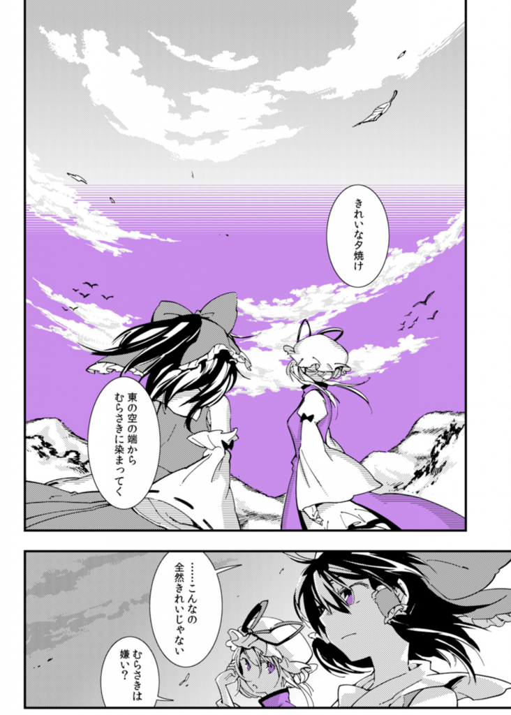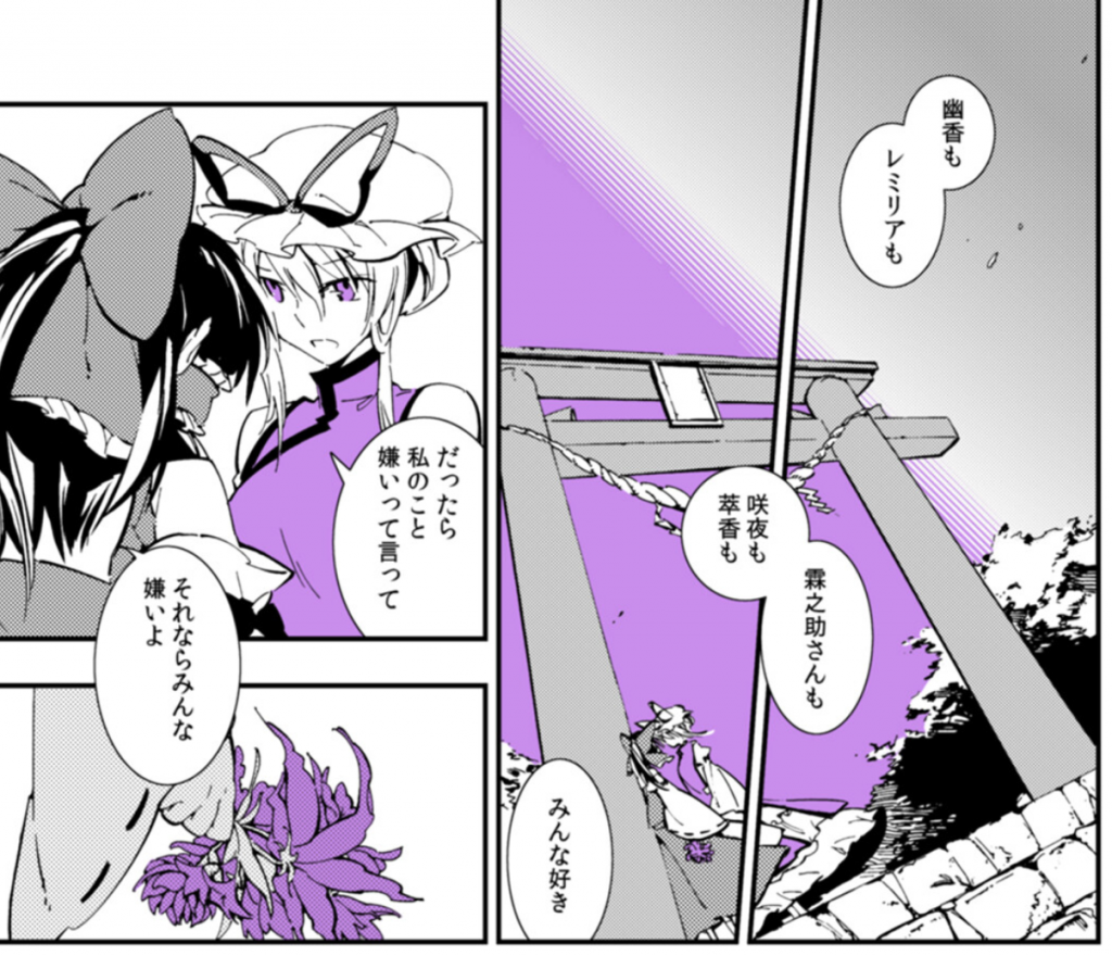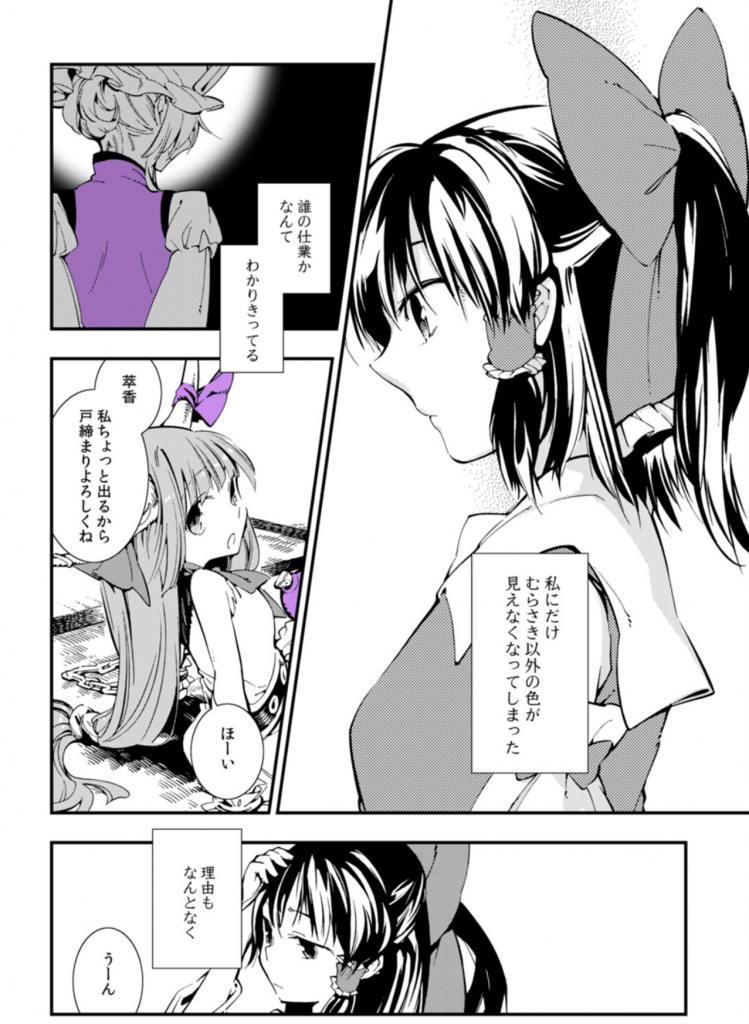 むらさき色以外が消え失せてしまった味気のない霊夢の視界を、二色刷り印刷をすることによって読者と共有しているのだ。冒頭をフルカラーで表現しているからこその印象的な落差に、読者もすんなりと霊夢に感情移入することができる。