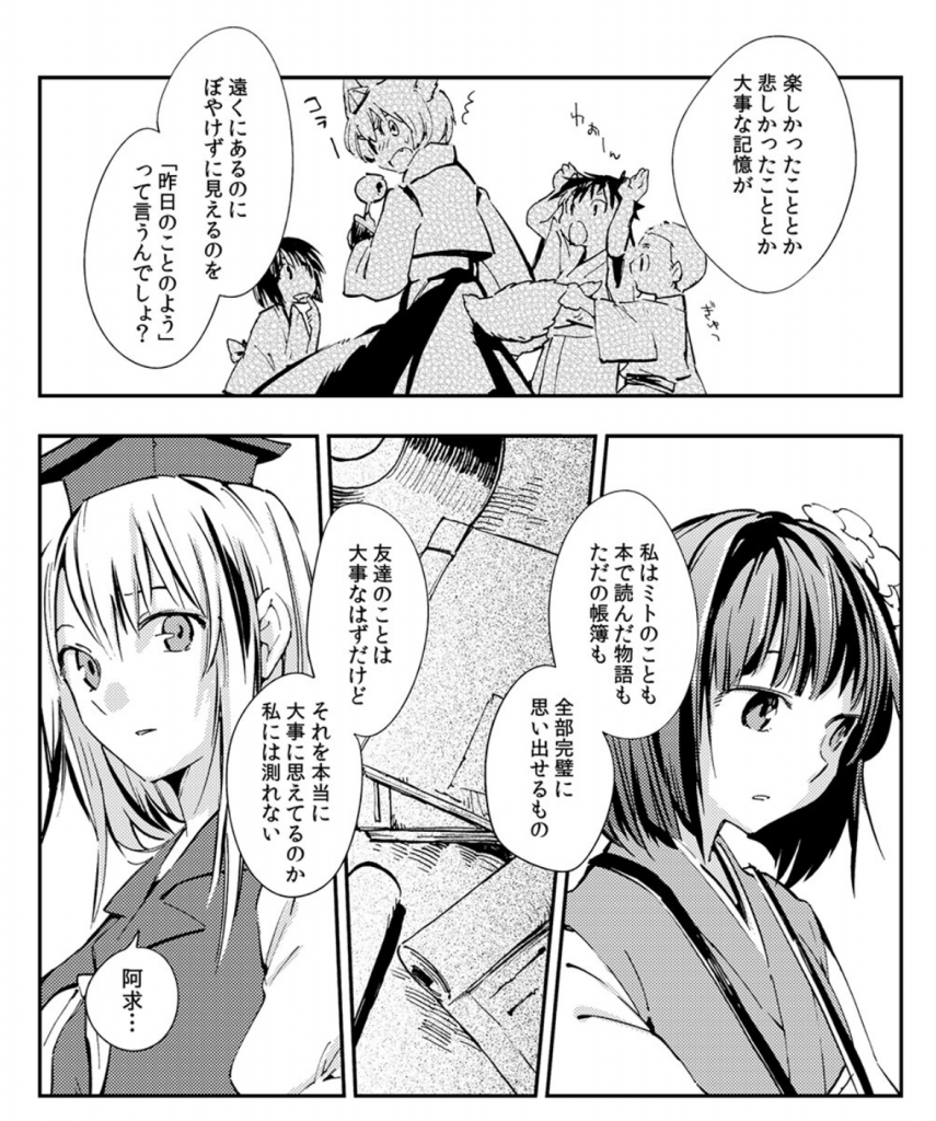 大事なものもそうでないものも等しく思い出せてしまう阿求は、そうであるが故に写真を撮る。写真は永遠ではないし固定されてもいない。古くなって色褪せ、擦り切れてしまう写真の中にこそ、彼女は大事なものを見測るのだ。