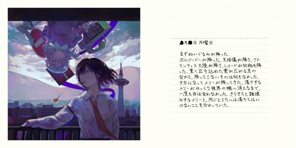 もしも他の誰かが、たとえば宇佐見蓮子が、その日記を読んだらどう思うだろうか? 一緒の時間を過ごしていたはずなのに、まるで世界の捉え方が違うのだとわかってしまったら。それとも、書かれた文字は全てメリーなりの冗談だと笑い飛ばすだろうか? その答えを確かめる方法がないことに気づいて怯えるのだろうか。