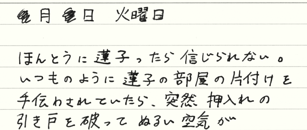 蓮子の文字は整った直線的な文字だ。とめはねはらいを丁寧に行い、文字は繋がっても崩れてもいない。雑な性格だったのなら、『空から』の『ら』は一筆書きになっているだろう。一文字一文字をきちんと記すことを意識しながら書いているのが見て取れる。