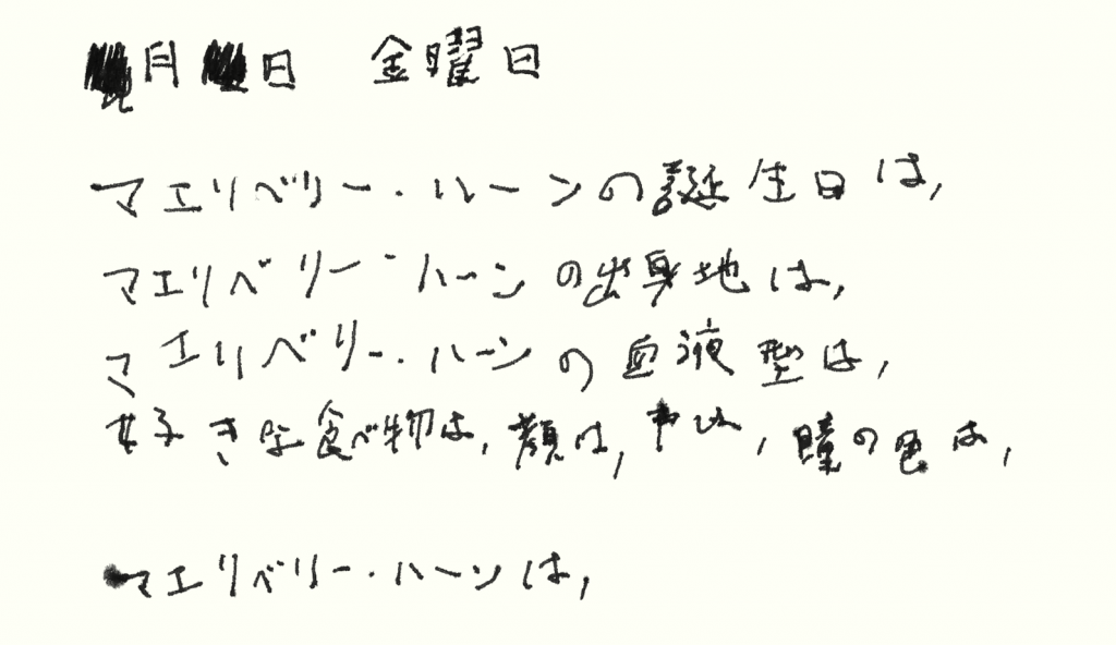 メリーの文字は丸みを帯びて可愛らしささえある文字だ。『い』や『た』、濁点や漢字の一部は筆記体のように繋げられて書かれているのが特徴だ。柔らかく流れるような文字は、まるでメリーに語り掛けられているかのようだ。