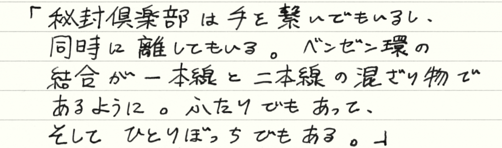 もっとも秀逸なのは、最後の『マエリベリー・ハーンは、』だ。この『マ』が素晴らしい。この大きなインクの滲みだけで、宇佐見蓮子の葛藤を想像することができる。ペンを紙に置き、けれどすぐ文字を書くことができず、手が固まってしまう。今頭の中にあることを、本当に書いてしまっていいのか、認めてしまっていいのか彼女は躊躇したのだろう。