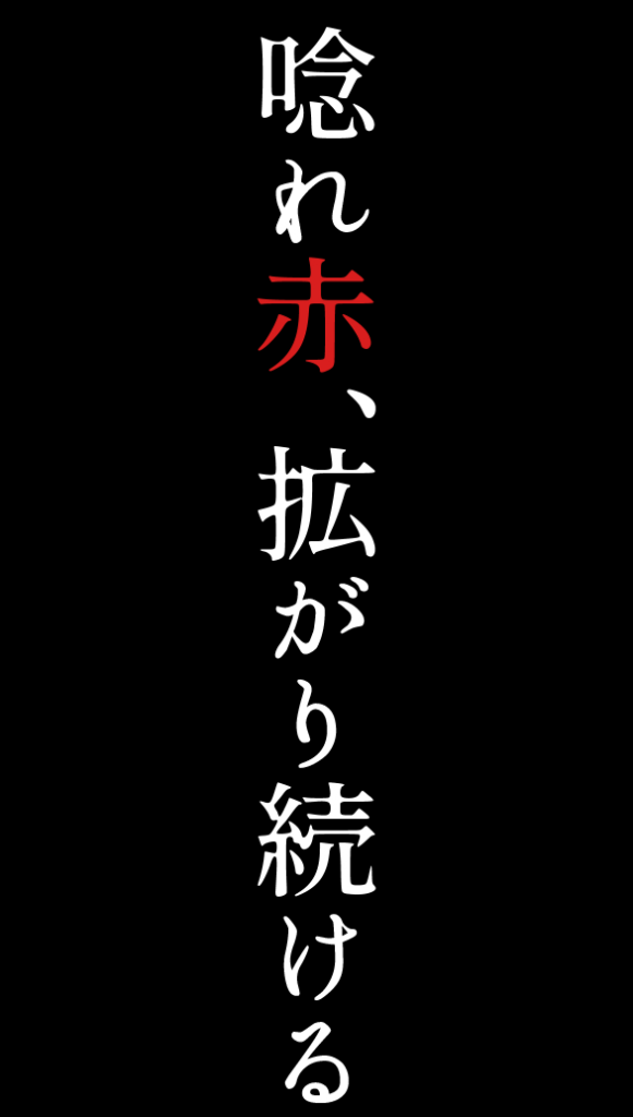こちらは蓮子について表現した詩の頁だが、背景は黒色になっている。ただし、先の何も見えない宇宙について表現した真っ黒の頁とは異なる。これは夜の色であり、夜の街の表現だ。文字の赤色にしても、生命と意思の色ではなく、夜を照らすネオンの色めいている。