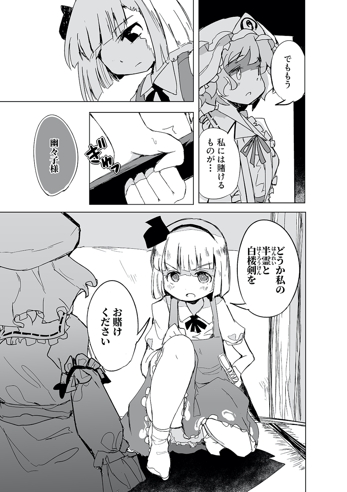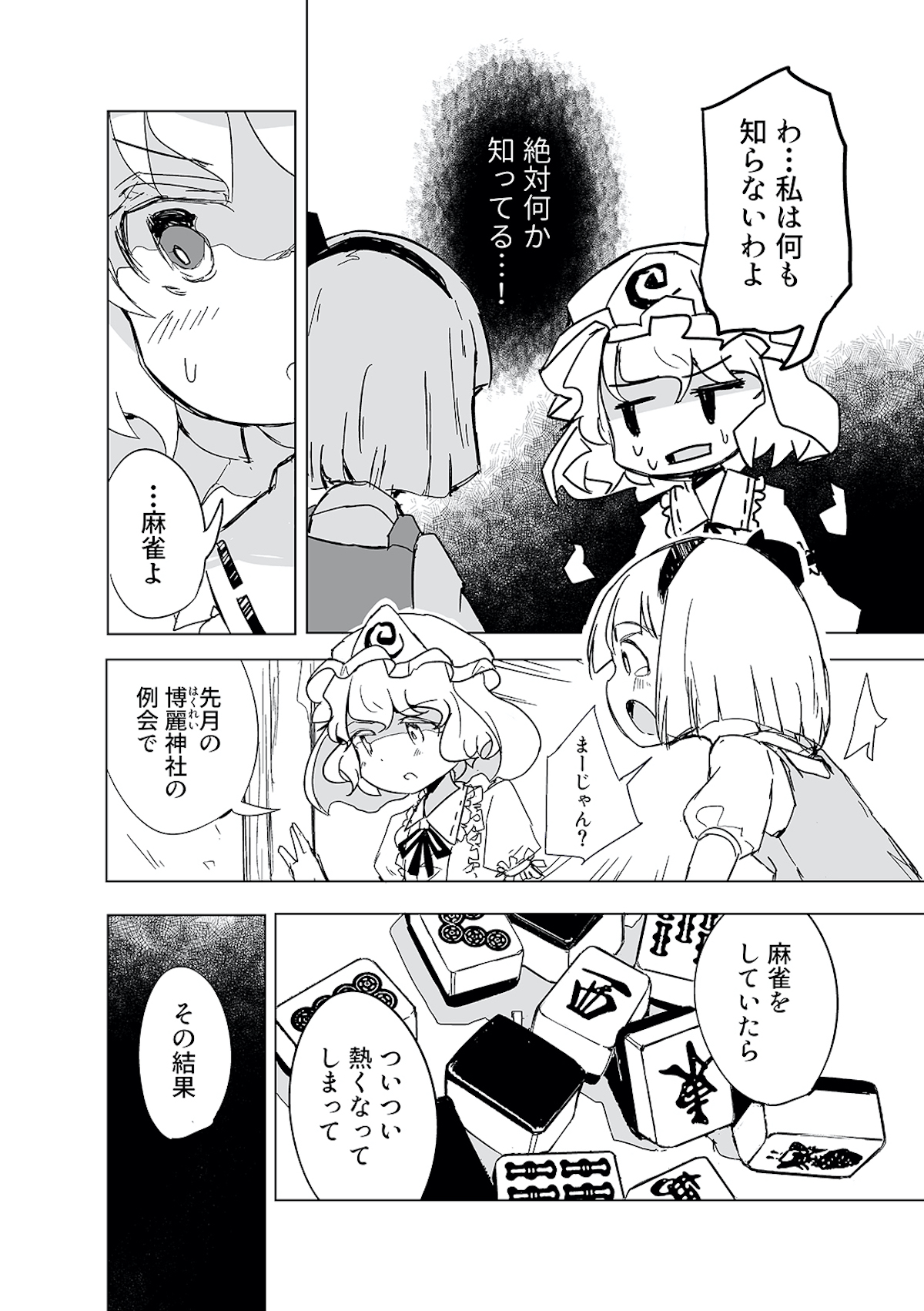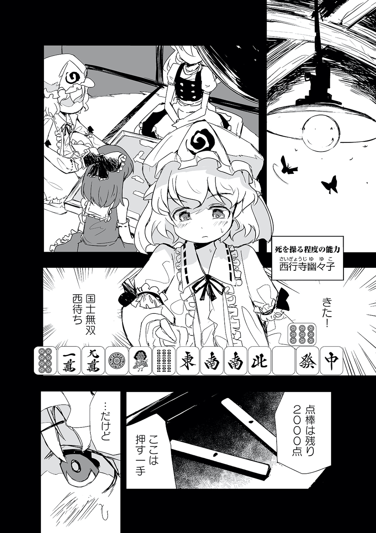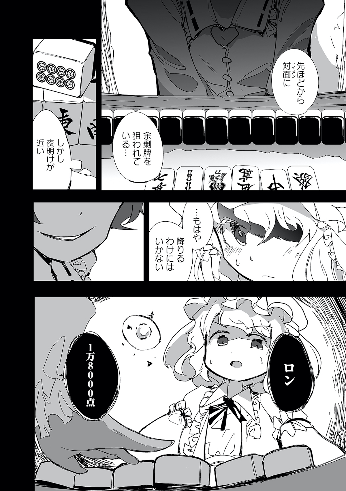 みょんなことから白玉楼の権利書を賭けて麻雀で勝負することになってしまった魂魄妖夢。だが麻雀初心者の妖夢に立ちふさがるのは「相手の心を読む程度の能力」を持つ妖怪・古明地さとり・・・ッ! はたして妖夢はこのピンチを潜り抜けられるのか?