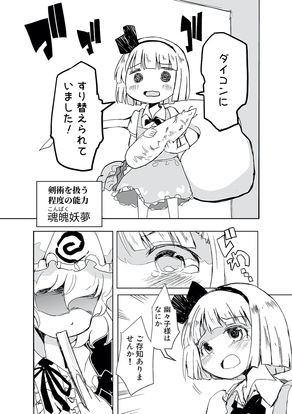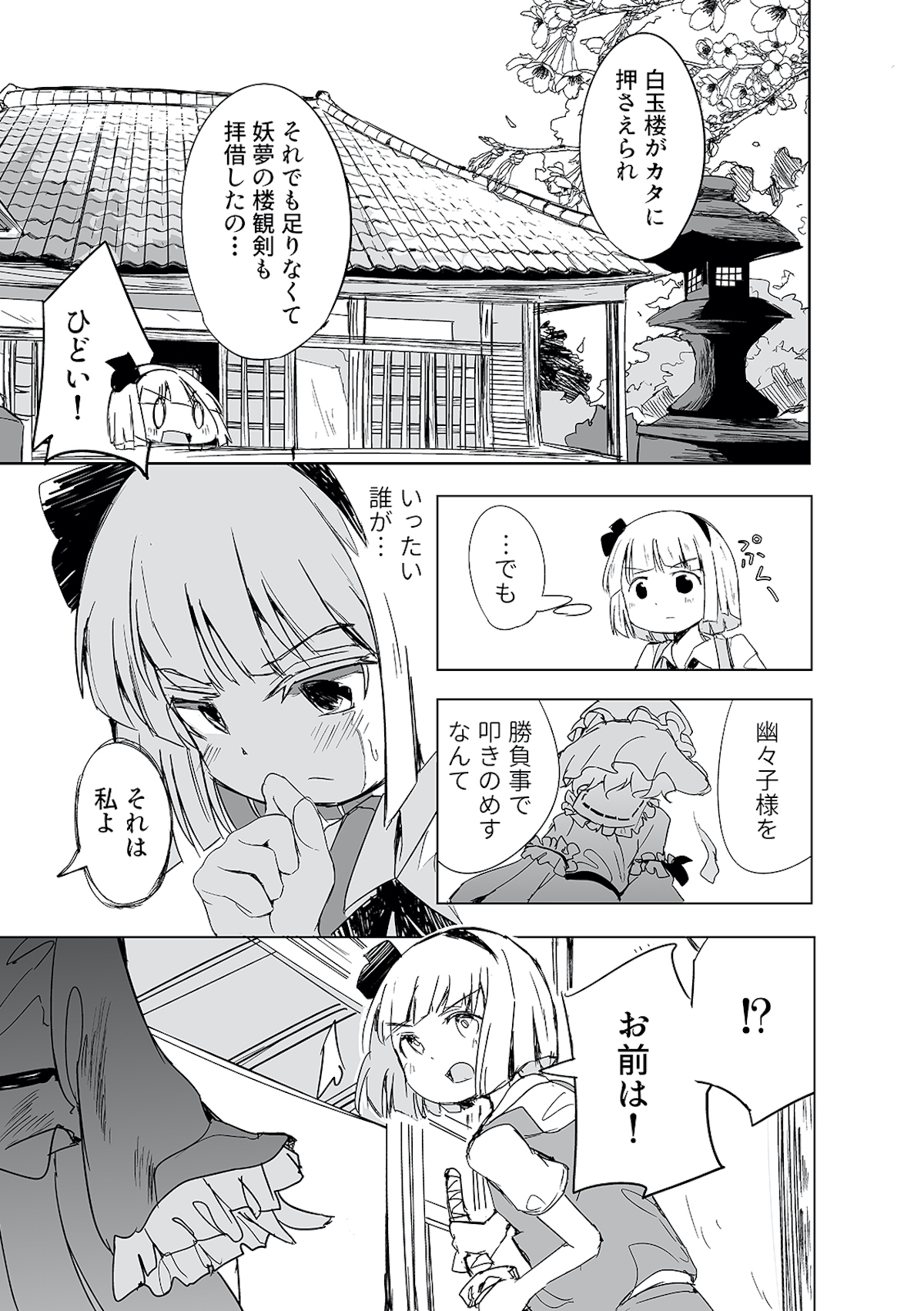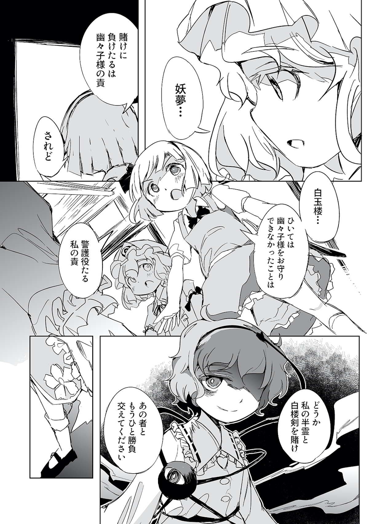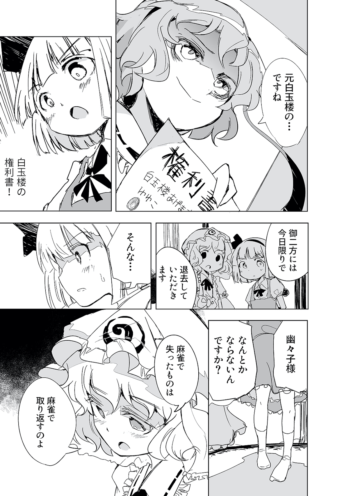 みょんなことから白玉楼の権利書を賭けて麻雀で勝負することになってしまった魂魄妖夢。だが麻雀初心者の妖夢に立ちふさがるのは「相手の心を読む程度の能力」を持つ妖怪・古明地さとり・・・ッ! はたして妖夢はこのピンチを潜り抜けられるのか?