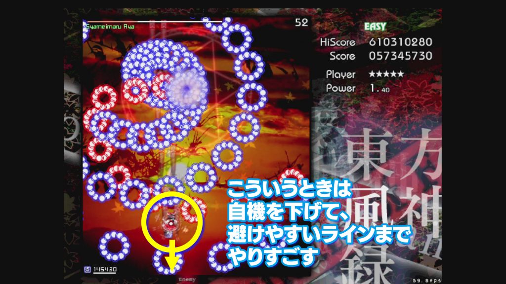 ボムを使わない場合は、画面下半分を全部使う勢いで、大きく動きましょう。真上から来る塊と横から来る塊を同時に避けないポイントを探すのが大事。