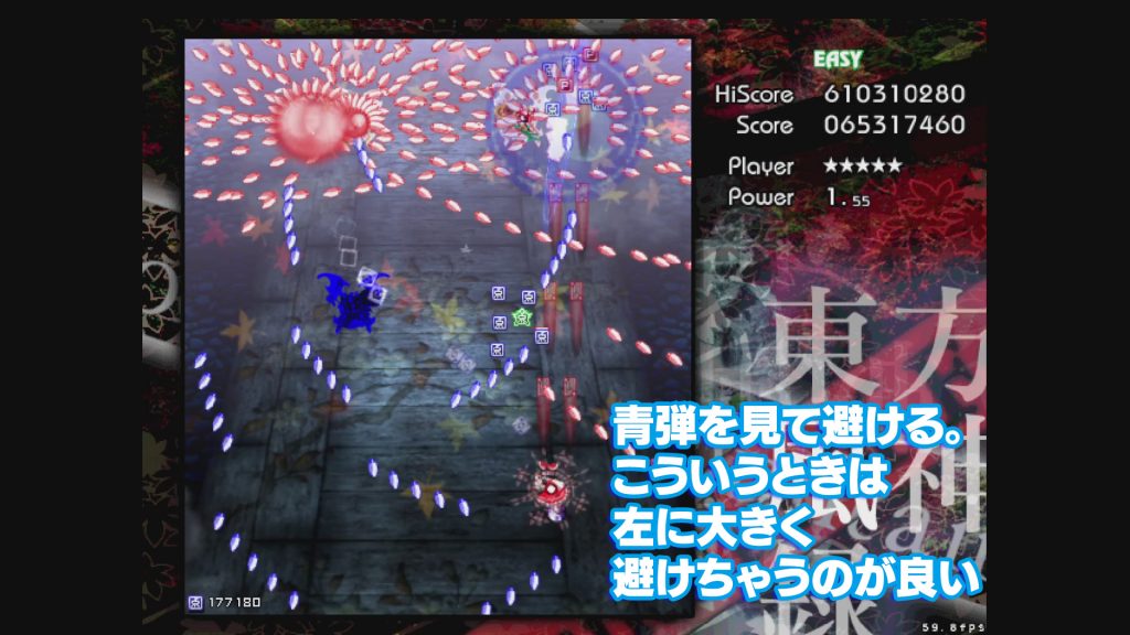 青と赤の自機狙いを避けるんですが、切り返しのタイミングが結構難しい印象……弾幕と弾幕の切れ目を狙って、一度わざと大きく動いて、そのあと逆方向に動きます(こういうのを切り返しと呼んだりします)。