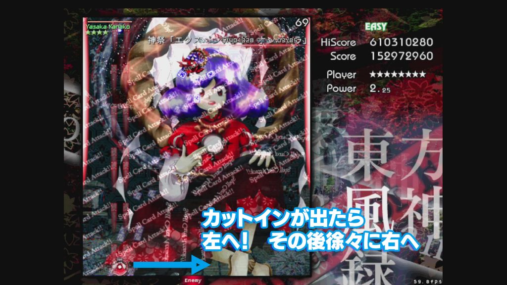 真ん中には御柱が降ってこないんですが、そこにずっといると自機狙いで潰されます。神奈子様のカットインが入ったらすぐ、左右どちらかに移動して自機狙いを誘導 ⇒ 御柱よりワンテンポはやく中央へ移動 ⇒ 今度は逆サイドで同じことをする