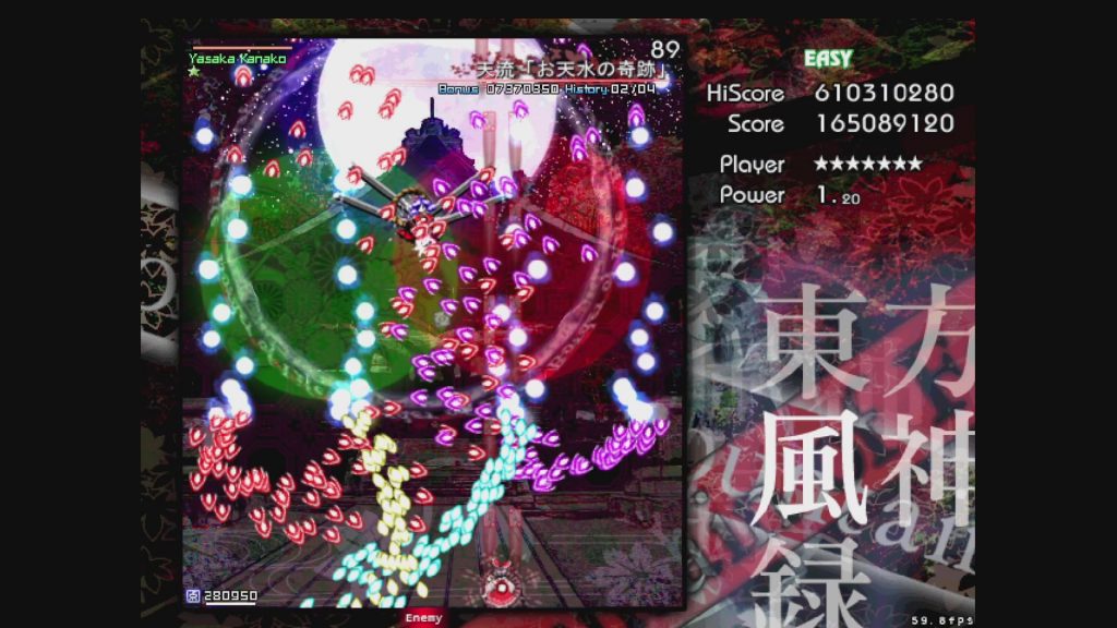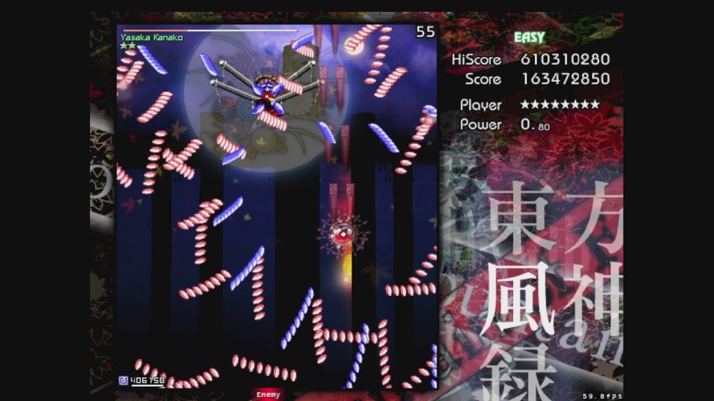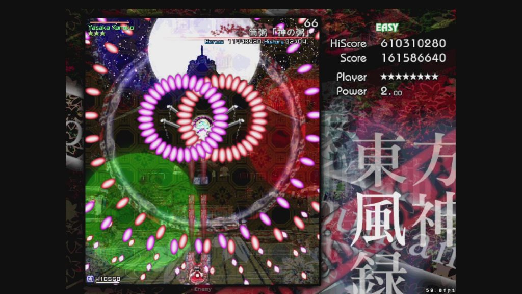 いよいよ最終ステージ。道中は短く、ほとんどがボス、八坂神奈子のスペルカードとなります。これまで培ってきた技術の集大成! 落ち着いて焦らず避けて、こわくなったらボムを撃ちましょう。