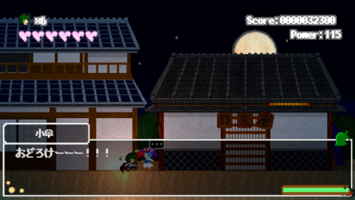 ちなみに、本作の主な登場人物は上記のとおり東方永夜抄のキャラクターが中心ですが、それ以外にも多数のキャラクターがゲスト参戦しています。チュートリアルに近い最初のステージで戦うエタニティラルバをはじめ、夜闇に紛れてふらふらしているルーミアやルナチャイルド、妖怪の隠れ里で元気に騒ぐ響子やプリズムリバー三姉妹、そして夜の人里に紛れ込む赤蛮奇にキスメ等々……シリーズの前後を問わず、たくさんの幻想少女たちと出会えるのもまた「リグルの物語」ならではのこと。
