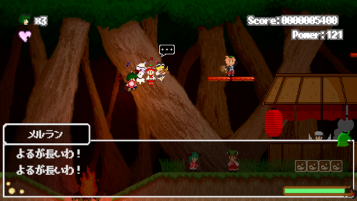 『Wriggle Story』というタイトルからも分かる通り、本作は東方永夜抄の1ボス「リグル・ナイトバグ」にスポットを当てたゲームです。リグルをはじめとする登場キャラクターは全て、かわいらしいドット絵で表現されており、全体的に懐かしみのある雰囲気となっています。