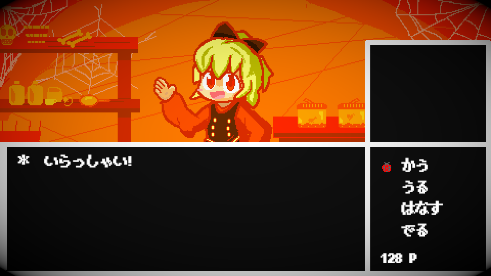 例えば、とあるステージの道中にたった一か所だけ、地底の人気者・黒谷ヤマメの隠れショップが仕込まれています。そこでは、僅かなPアイテムを対価にオプションの虫を購入することができるのですが、妖怪の隠れ里などにあるショップとは全く異なるUIで表現されているんです。しかも、システム上特に何も売るアイテムなど用意されていないのに「売る」のコマンドがあったり、「話す」のコマンドで店主のヤマメと会話を楽しむことができたり……と、なぜかここだけ全くの別ゲーをプレイしているかのような雰囲気が広がっています!