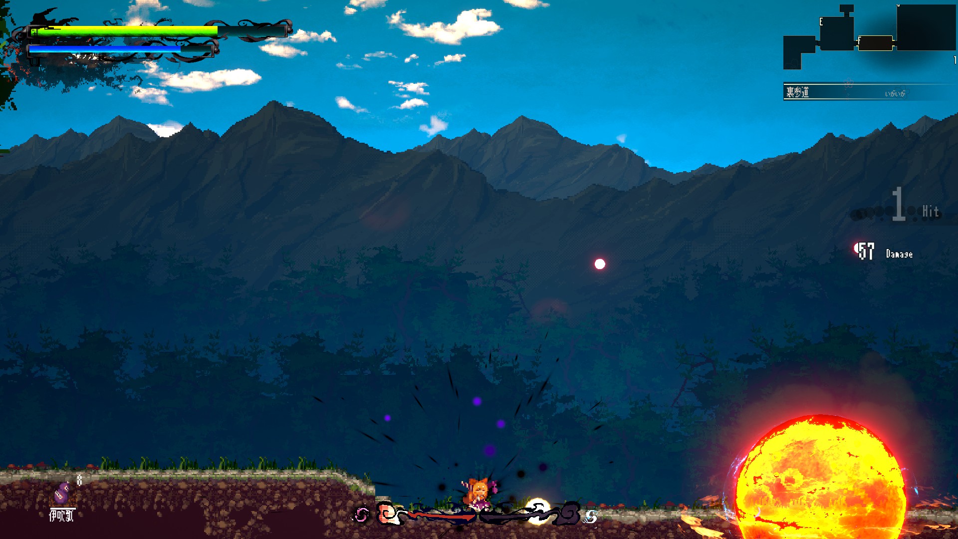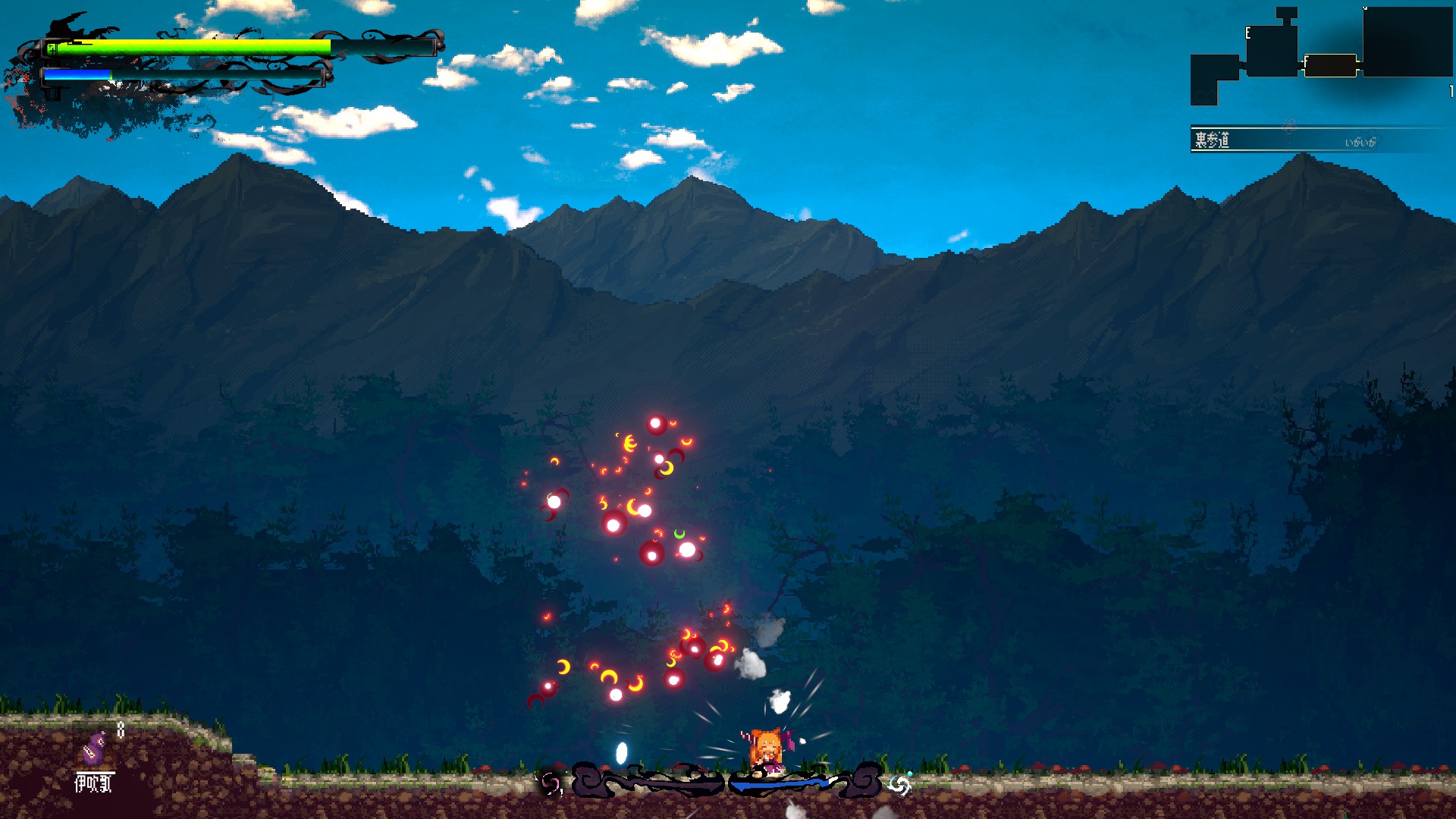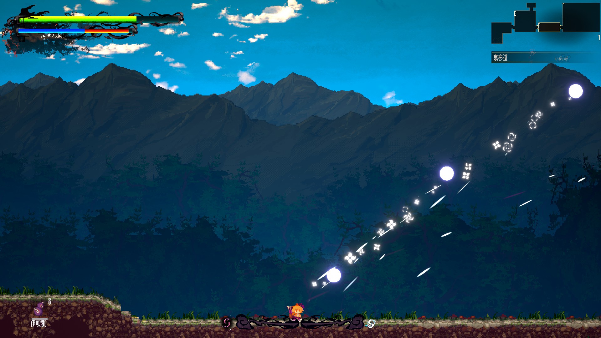 そしてその世界を我が物顔で闊歩するキャラクター。ともすればどこにいるかすら見失いそうな彼女たちは、コミカルな動きやド派手なエフェクトで否応なく存在感をアピールし、その広大な世界に負けず劣らず強烈に自分自身を誇示し続けている。山道を縦横無尽に駆け巡る萃香も、彼女が主人公であればこそ、彼女の目に見える「順路」はそういう風になっている、といわんばかりである。