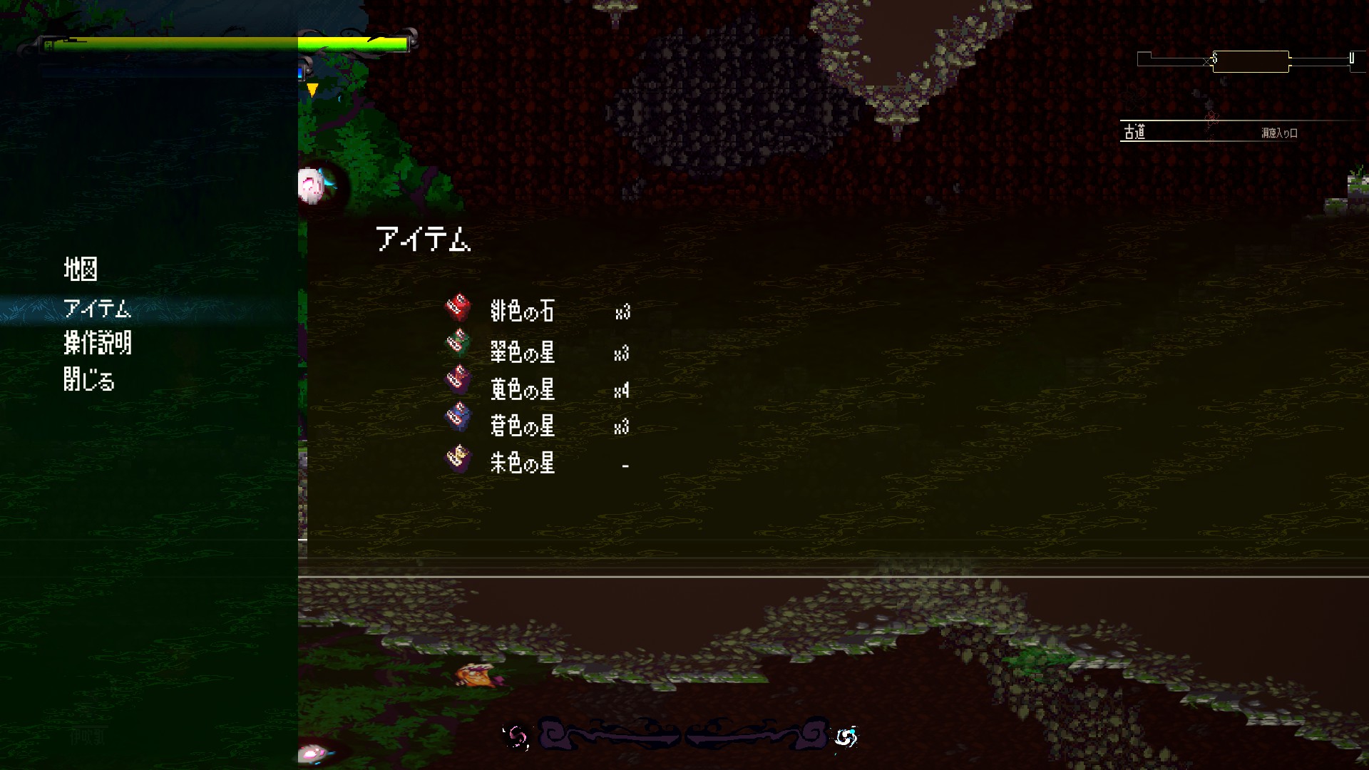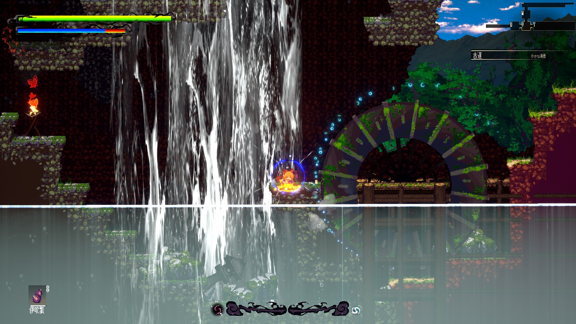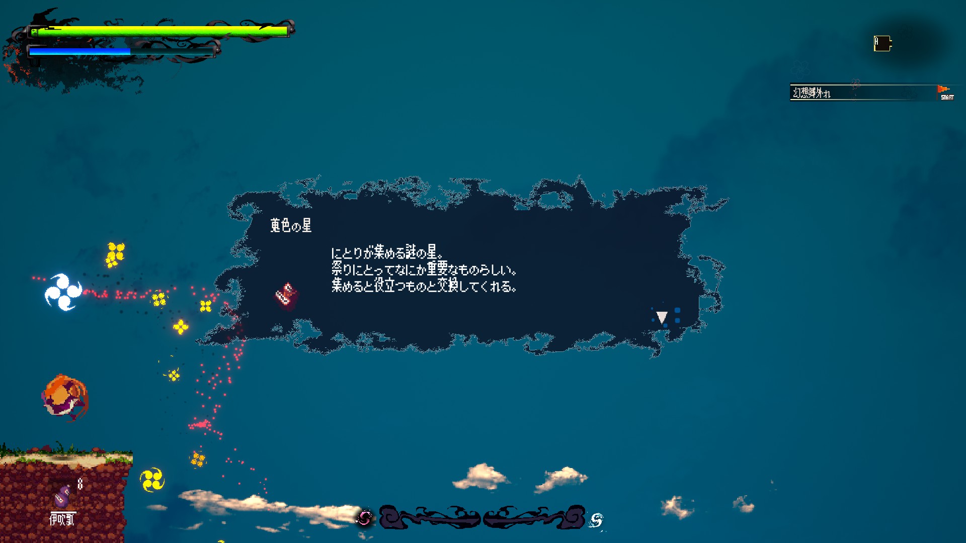 そしてその世界を我が物顔で闊歩するキャラクター。ともすればどこにいるかすら見失いそうな彼女たちは、コミカルな動きやド派手なエフェクトで否応なく存在感をアピールし、その広大な世界に負けず劣らず強烈に自分自身を誇示し続けている。山道を縦横無尽に駆け巡る萃香も、彼女が主人公であればこそ、彼女の目に見える「順路」はそういう風になっている、といわんばかりである。