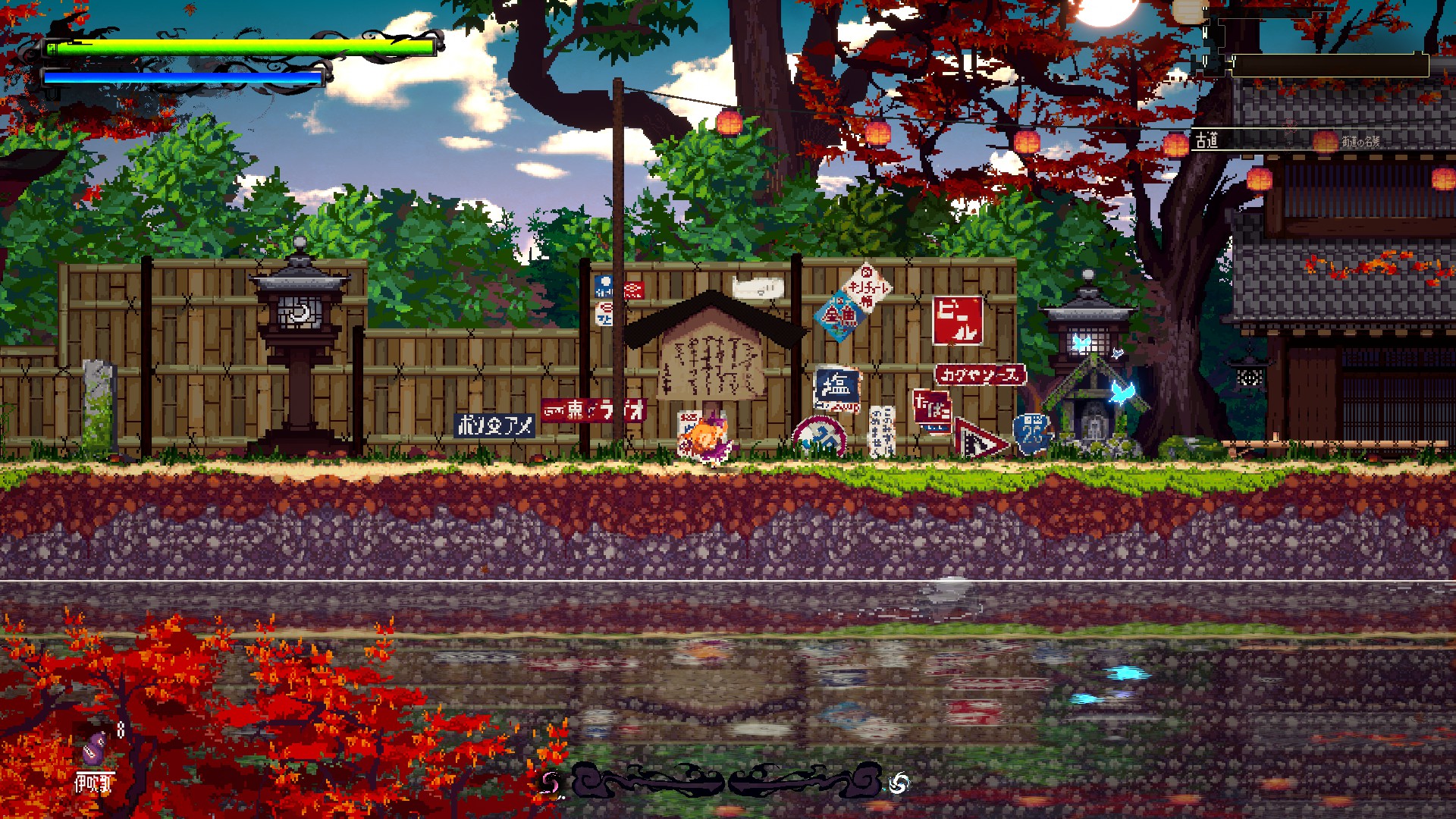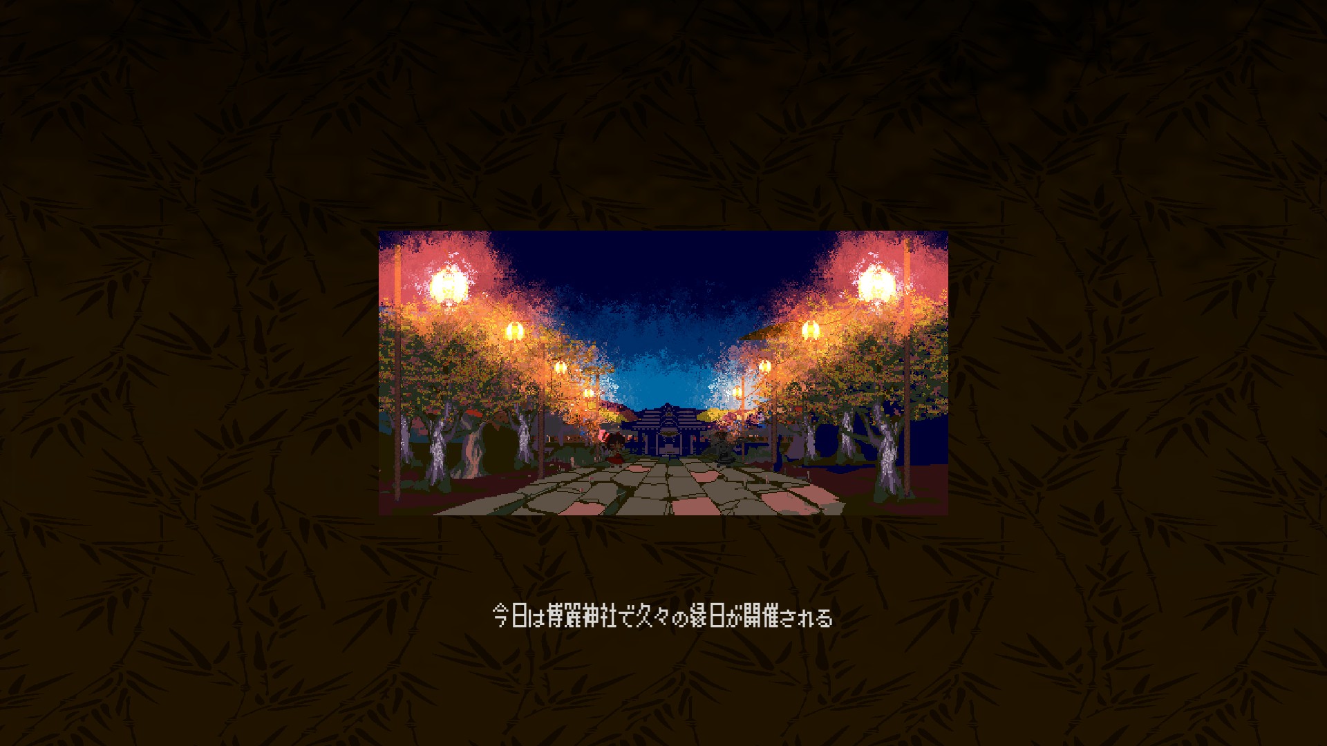 このゲームの特筆すべきデザインとして、キャラクターに対しての画面が広すぎるくらいに広いことが挙げられるだろう。その広さを余すところなく美しく彩られた世界は、精細なアートワークによって説得力を増している。遠くまで見通せる山々、木々の隙間から射す日光、空には鳥が飛んでいる。紅葉が舞い散る中に、ひぐらしの鳴き声をまとわりつかせ、初秋を感じさせる。この日常に、ほんの少しのハレの日。祭りの到来が近づいている、そんな情景をあまりにも違和感なく連想させる。