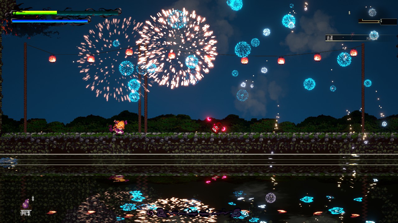 ゲームを彩る演出の数々も、プレイヤーに何ら違和感を感じさせることなく、非常に、あるいは異常に高いレベルでまとまっている。高速で飛び回るキャラクターを絶妙な速度で追従するカメラワーク。ノスタルジーとコンテンポラリーを同居させる色彩感覚,エフェクトのデザイン。飛び散る水しぶき、水面にうつる世界、凍りついた滝。花火、爆発によって引き起こされるプレイヤーの網膜を焼き尽くす過剰なまでのライティング。すべてが「このゲームにとっての当たり前」として組み込まれているからこそ、本作で描かれる「幻想郷」を、プレイヤーはかえって自然に受け入れられているのである。
