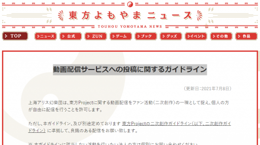 7月8日追記:動画配信サービスに関する東方Projectガイドラインが、新たに公開されました!!