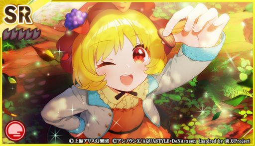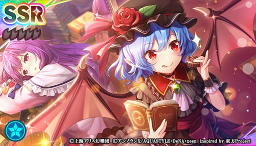 本夢見くじに、SSRミタマカード「[感情をカタチにする程度の魔法]レミリア・スカーレット」、SRミタマカード「[カカオ豆に豊穣の女神は微笑むか?]秋 穣子」が登場しました。この新ミタマカード2枚は、本夢見くじの開催期間中のみ登場します。また、本夢見くじでは、新ミタマカード2枚の提供割合が同レアリティのミタマカードと比較してアップしています。
