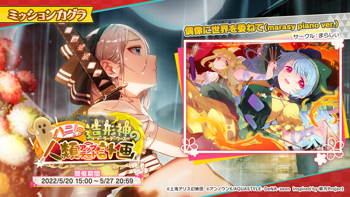 本イベントに合わせて、楽曲「偶像に世界を委ねて(marasy piano ver.)」や「Iconoclasm」がプレイ可能になるほか、本作初参戦となる「埴安神 袿姫」のミタマカードが登場する夢見くじ(ガチャ)「ハニワになってはみませんか?」を開催中です。また、2022年5月27日(金)に、新ステージ「Ura Kagura:断罪は遍く人間の元に」が登場予定です。