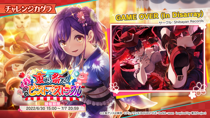 また、本イベントでサークルShibayan Recordsの楽曲「GAME OVER (In Disarray)」がプレイ可能になりました。さらに、2022年7月4日(月)には、サークルIOSYSの楽曲「博麗神社町内会音頭」も登場予定です。なお、本イベントのストーリーやキャラクターについては、2022年6月29日(水)に放送した「ダンカグ通信Vol.26」でも紹介しています。このほか、本イベントの詳細は、ゲーム内お知らせから確認できます。
