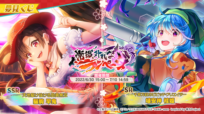 本夢見くじに、SSRミタマカード「[天地駆け抜ける勁勇無双]驪駒 早鬼」、SRミタマカード「[千紫万紅のビビッドクリエイター]埴安神 袿姫」が登場しました。「驪駒 早鬼」は、本作で初登場です。また、本夢見くじでは、新ミタマカード2枚の提供割合が同レアリティのミタマカードと比較してアップしています。
