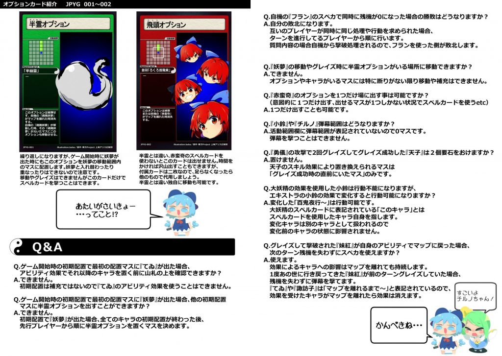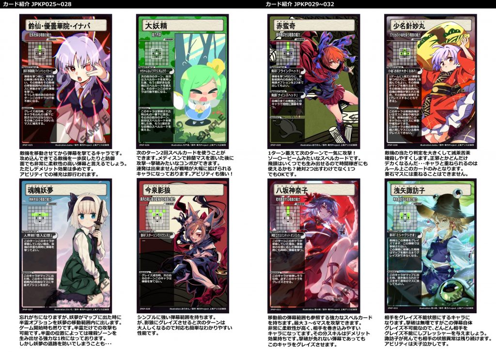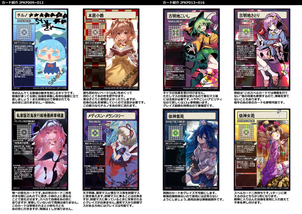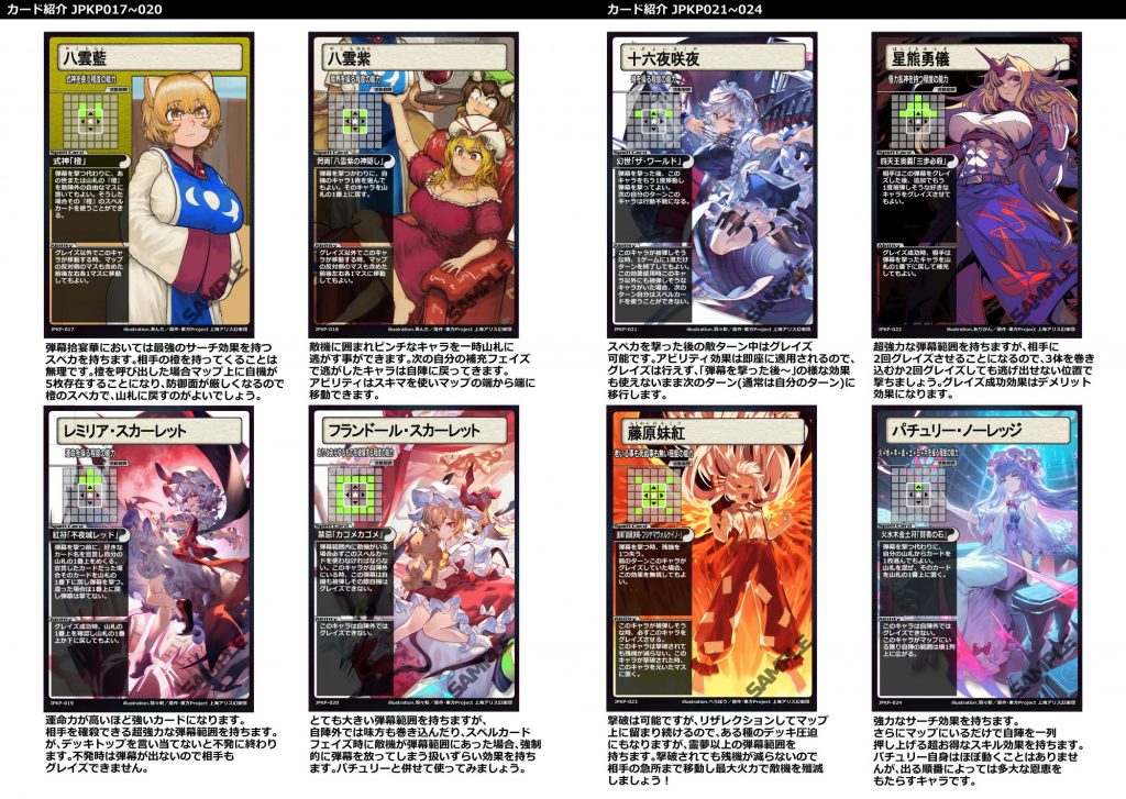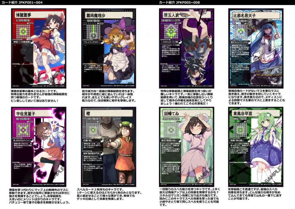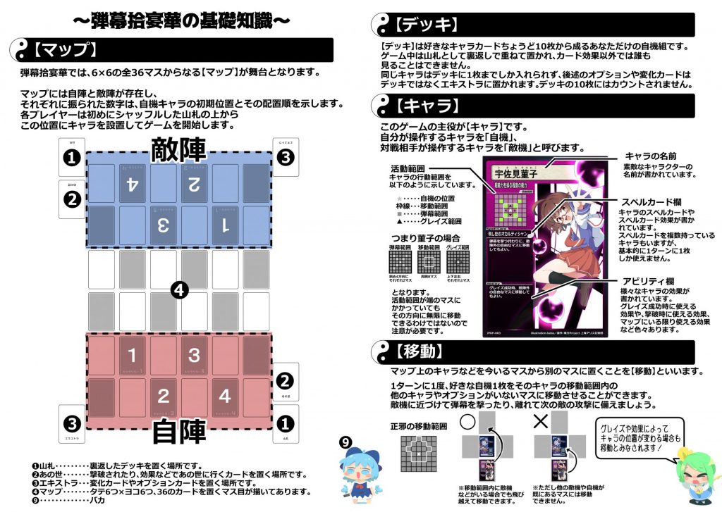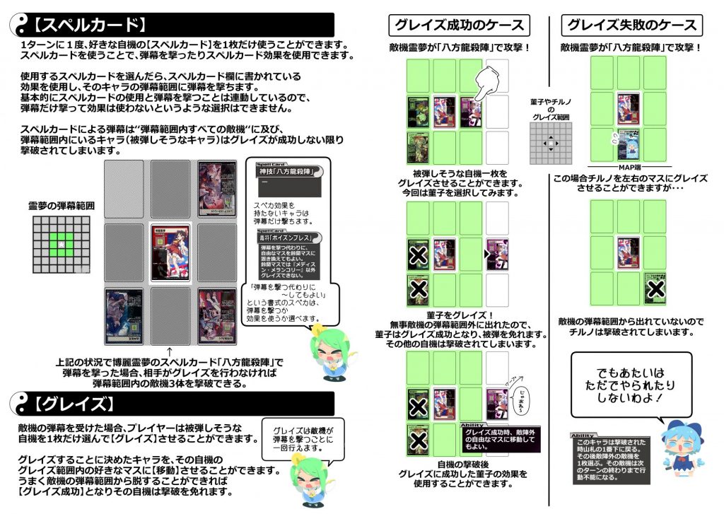 6×6の”マップ”に各々が自由に組んだ”山札”から”キャラ”を設置。フィールドを縦横無尽に”移動”させながら”スペルカード”で弾幕を撃ったり敵キャラの弾幕を”グレイズ”で回避。