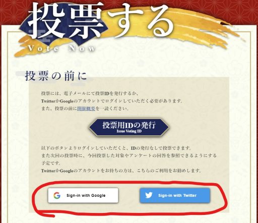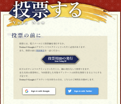 今年より、GoogleアカウントまたはTwitterアカウントでログインする形でも、投票が可能になりました。ログインした場合は、投票用IDを発行する必要がありません。